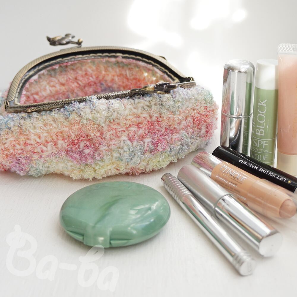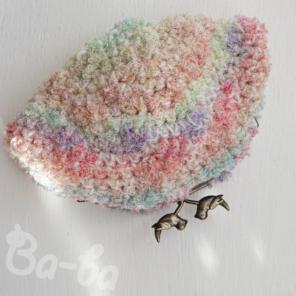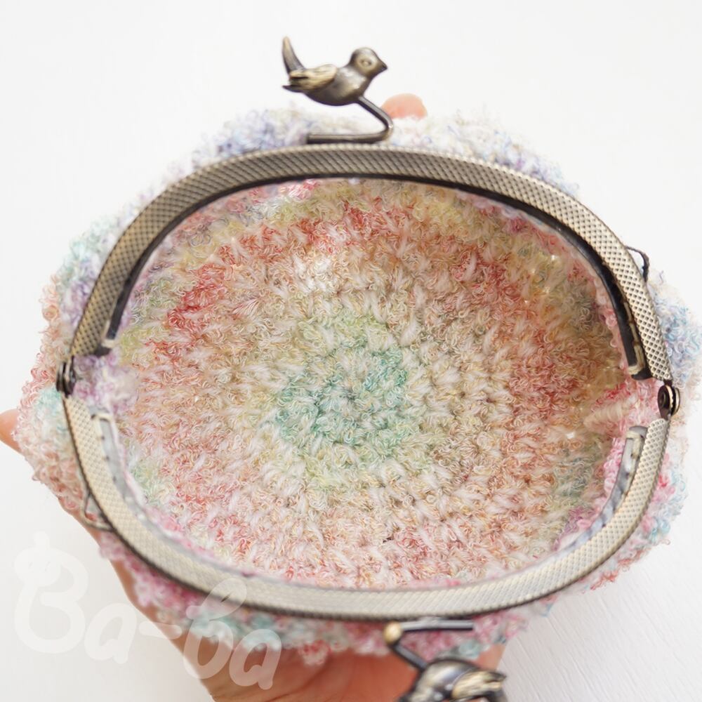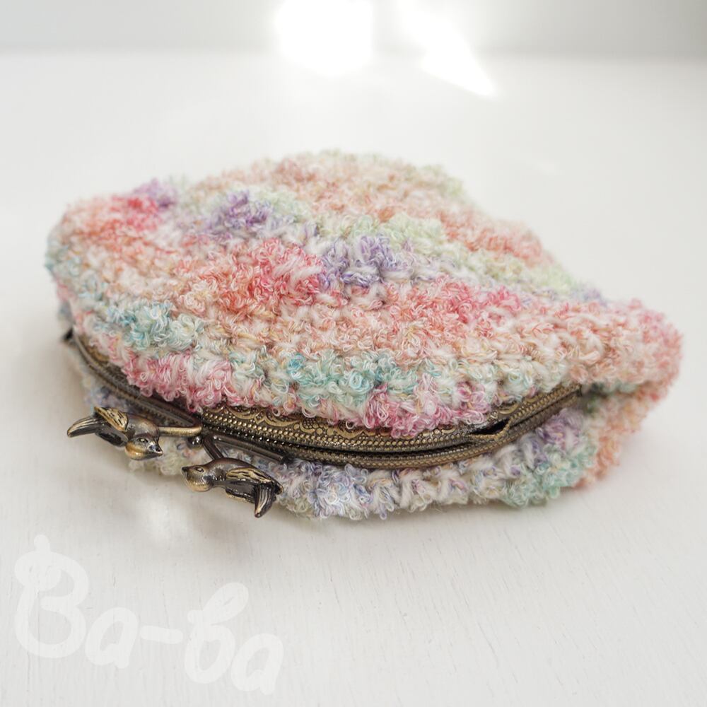 ふわふわの編み地には、小鳥つまみの口金を組み合わせました。