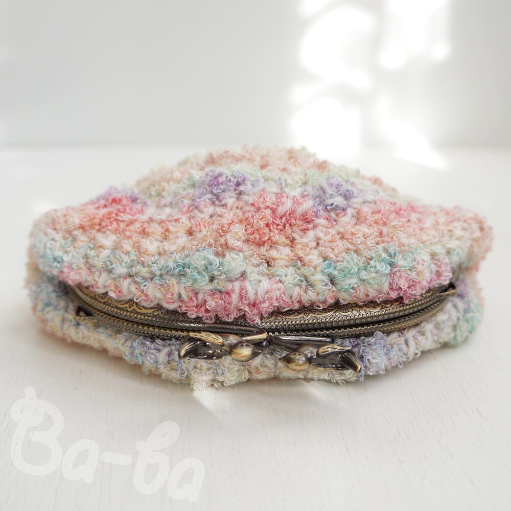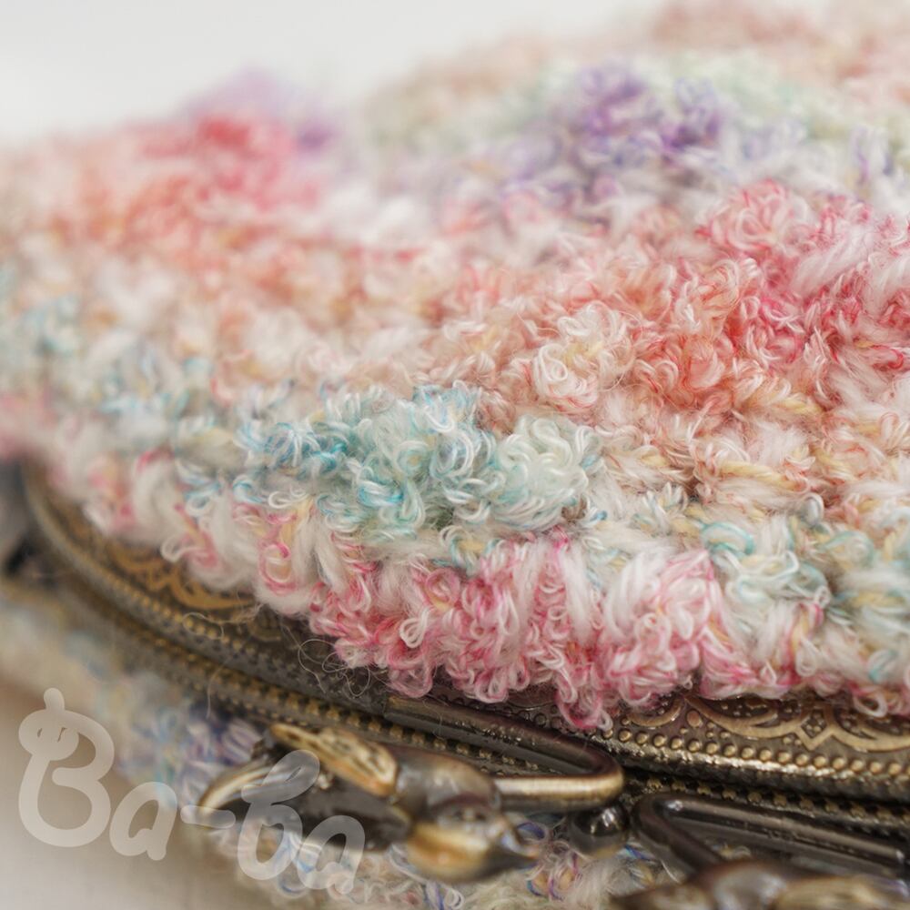 虹色の毛糸をふんわりと編み上げ、がま口に仕上げました。