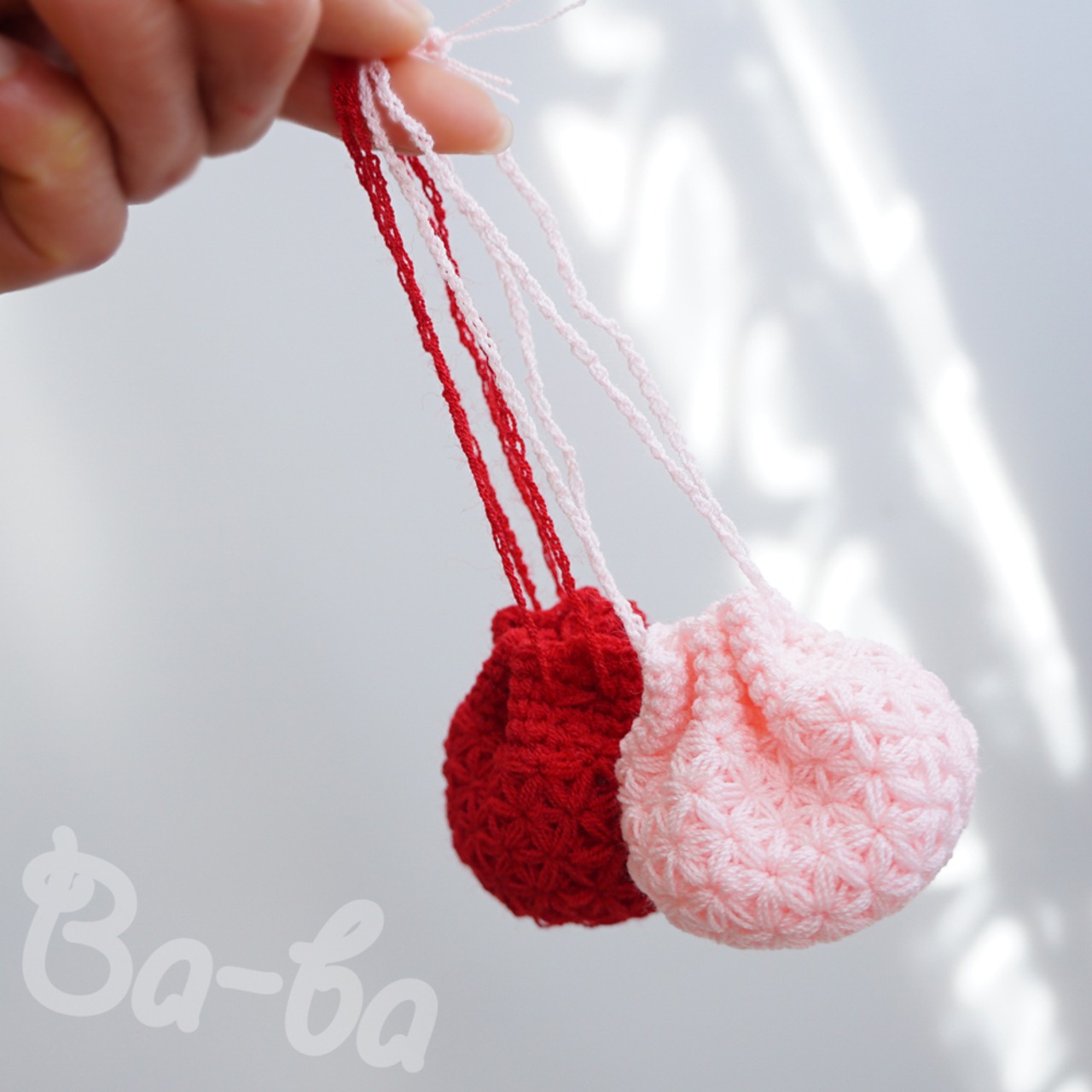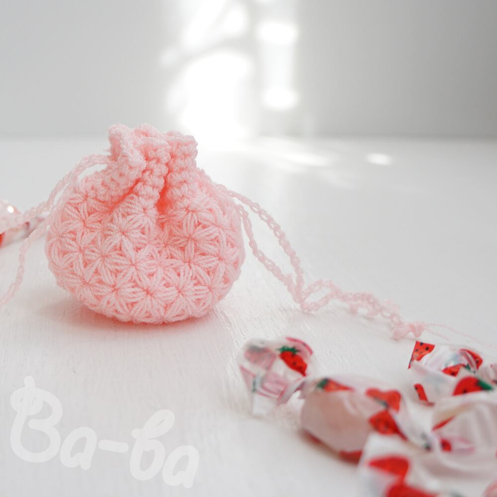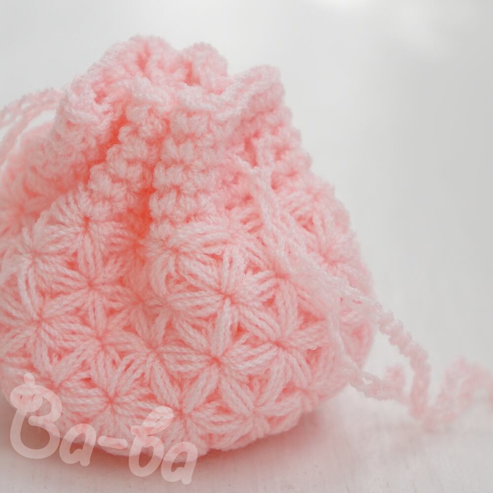 ばあば作、細かいリフ編みの豆巾着(sakura pink・KPPPR11)