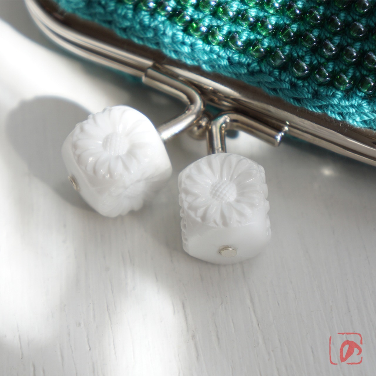 ばあば作☆☆総ガラスビーズのスクエアがま口(cube white-flower ・1873)