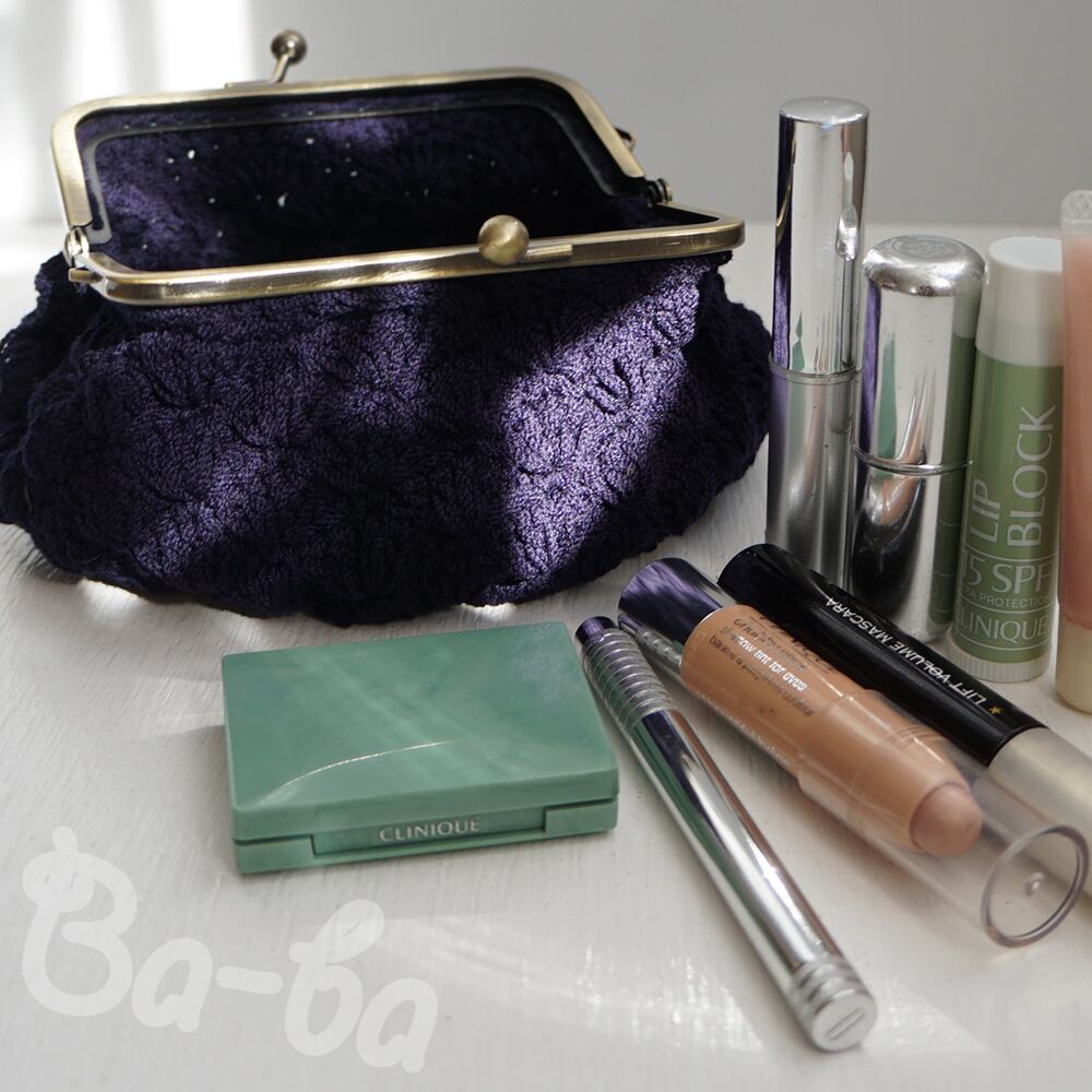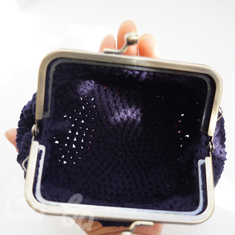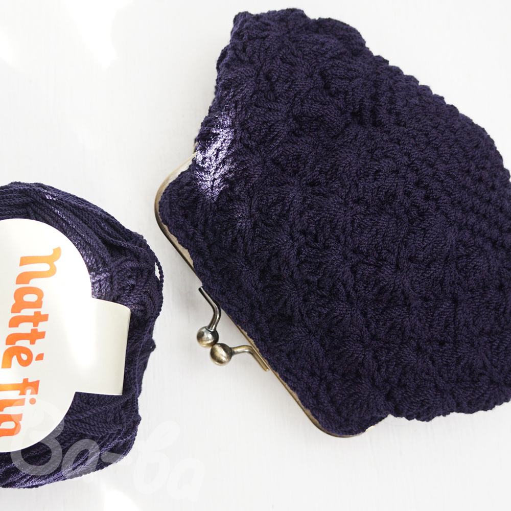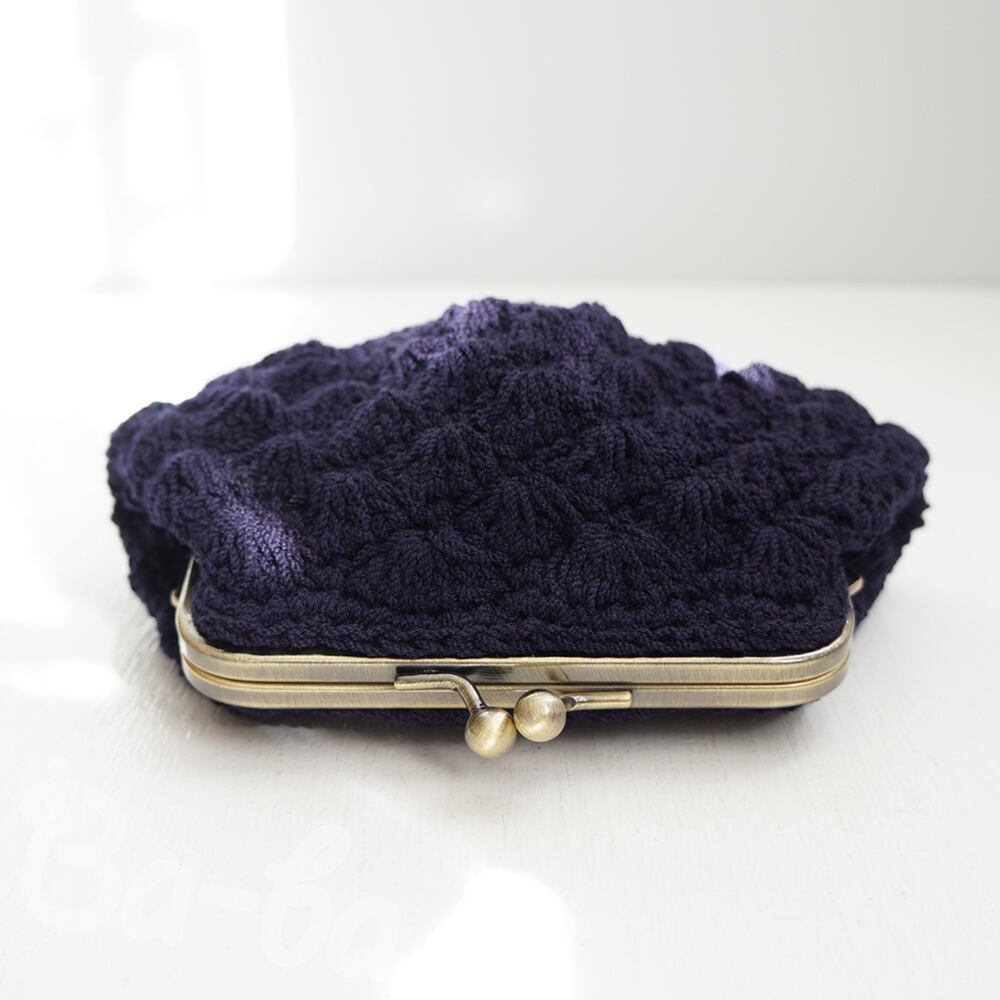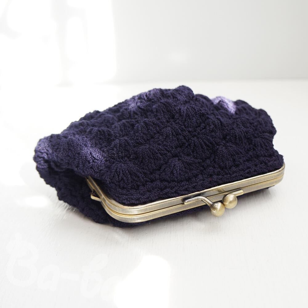 濃紺のサマーウールを松編みでふんわりと編み上げ、シンプルな口金を合わせました。