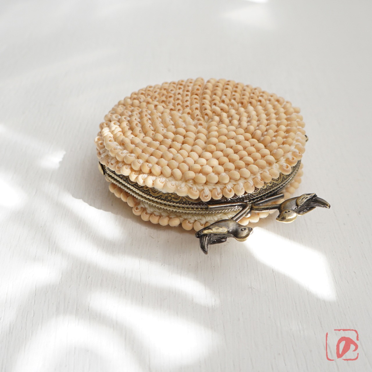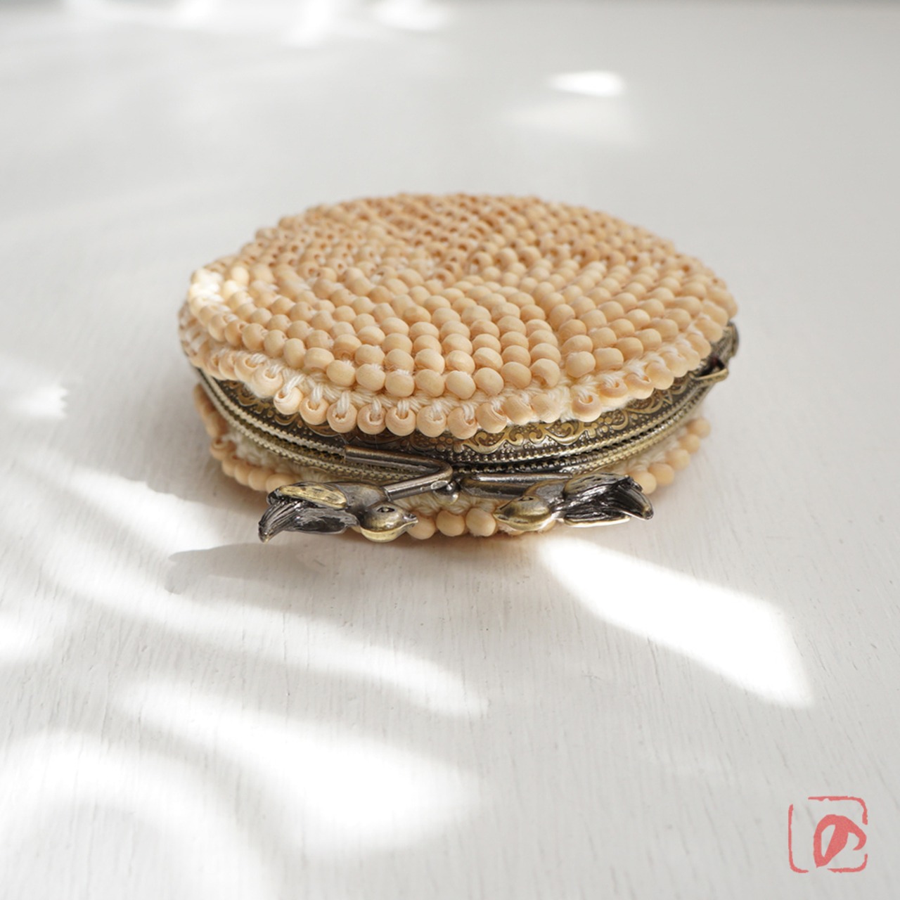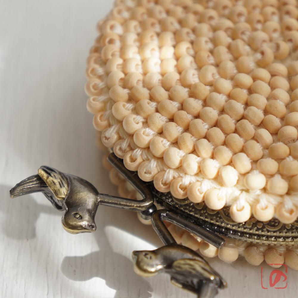 ばあば作、ウッドビーズのナチュラルまんまるがま口(metsän lintu・1887)