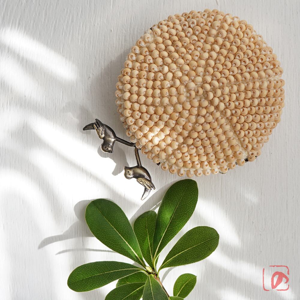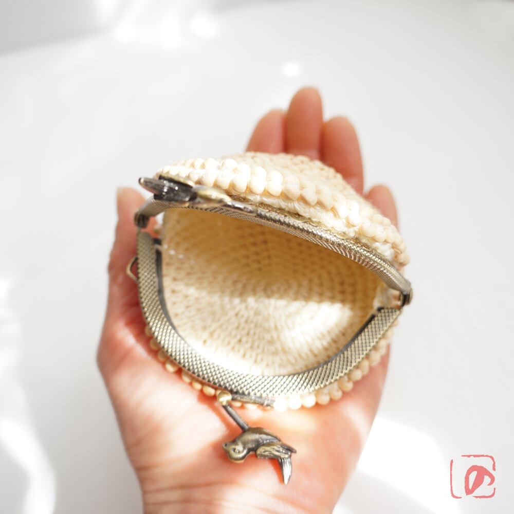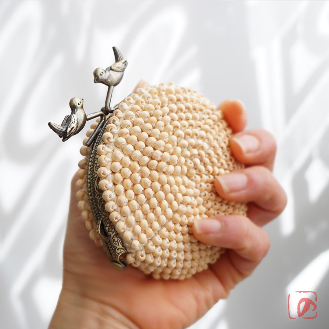 小鳥のつまみの口金はウッドビーズの編み地にピッタリ♩