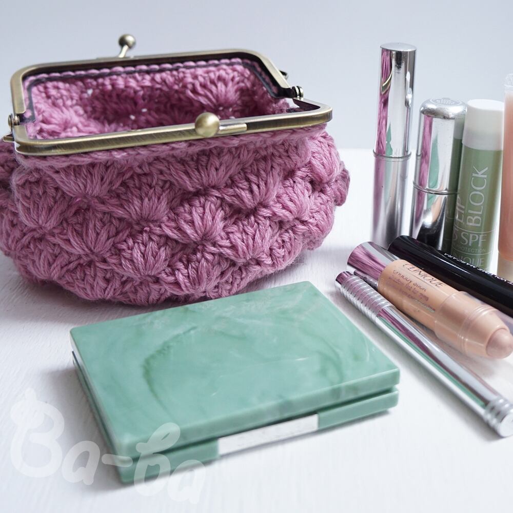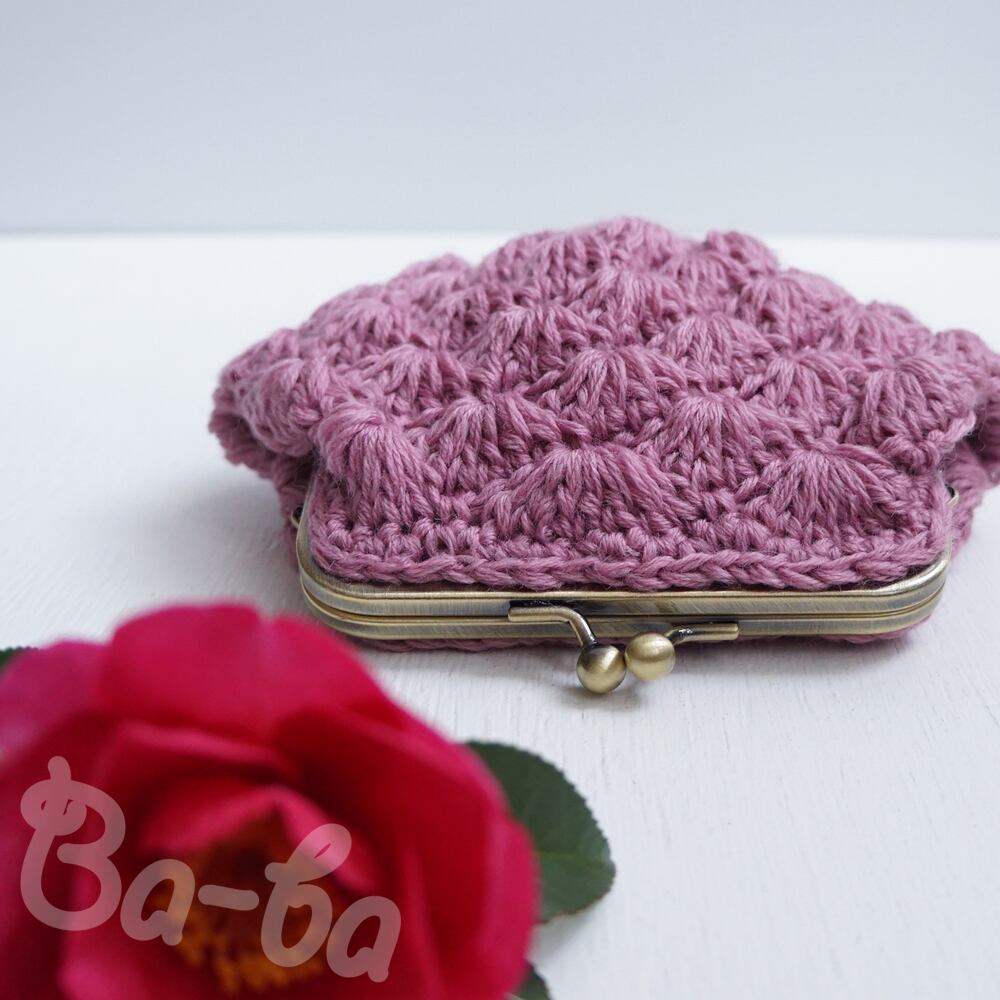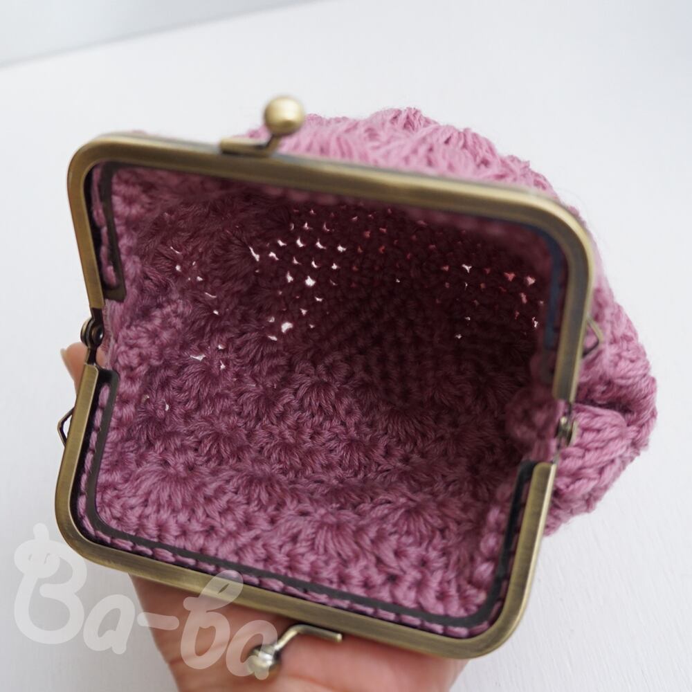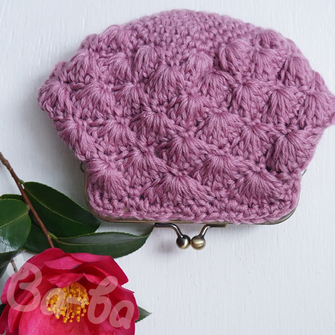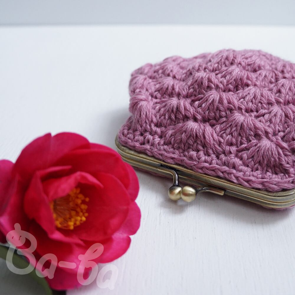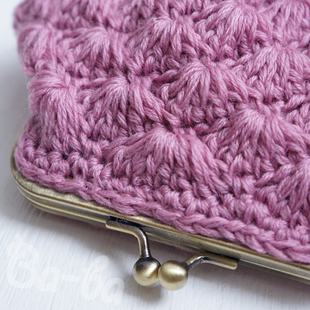 優しい薄紫色の毛糸を松編みでふんわりと編み上げ、シンプルな口金を合わせました。