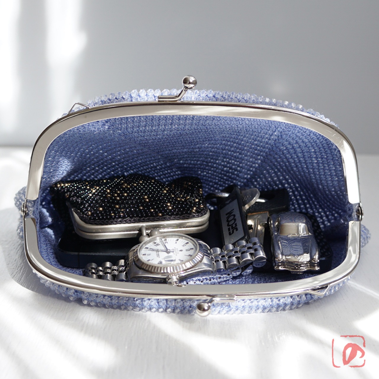 ガラスビーズの作品と比較して軽量・軽快なポーチです。