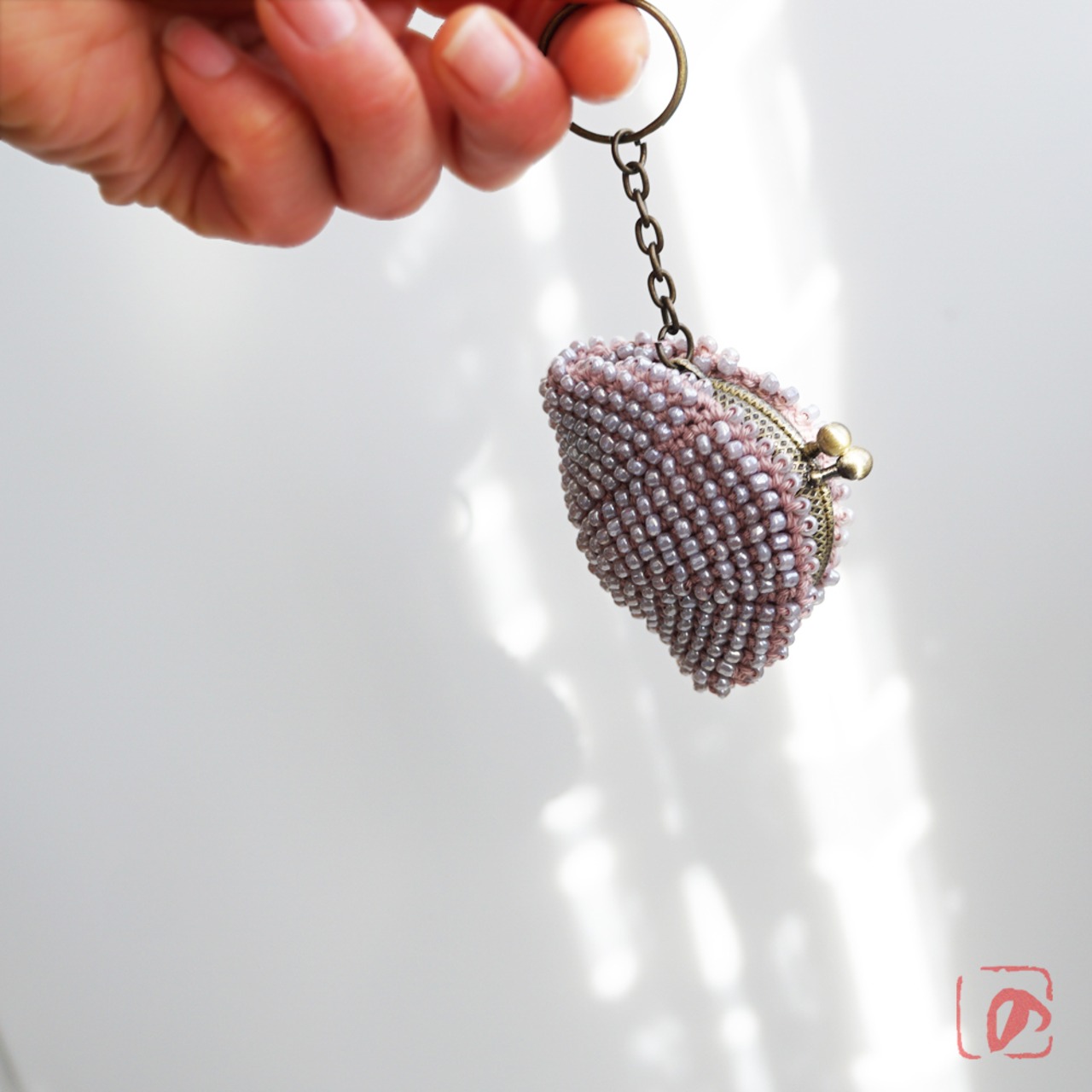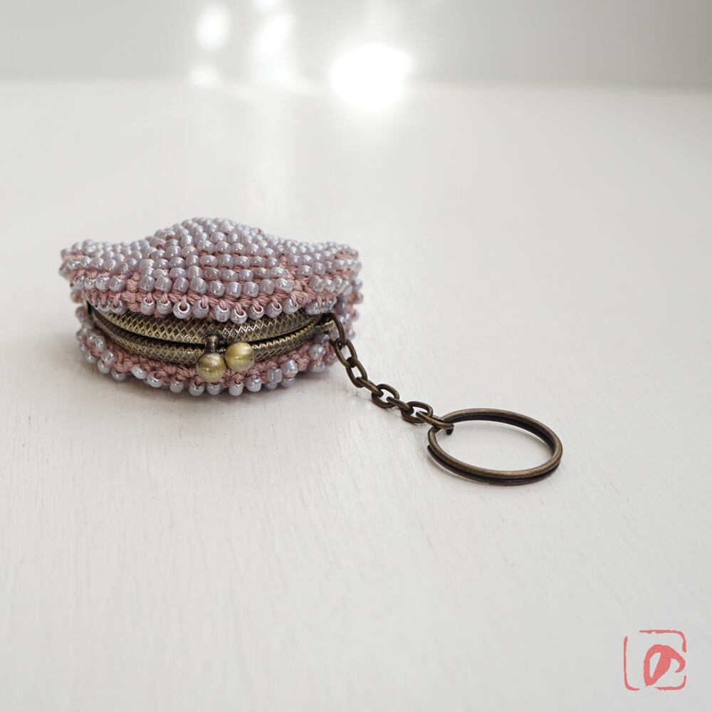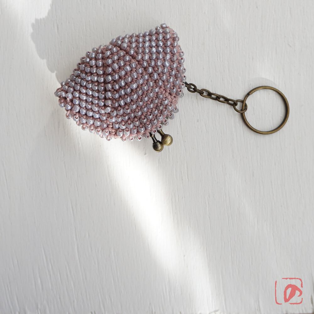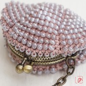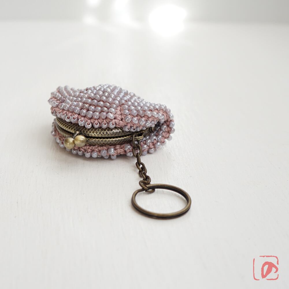 くすみピンクの糸にグレーのビーズを組みわせてニュアンスカラーのがま口に仕上げました。。