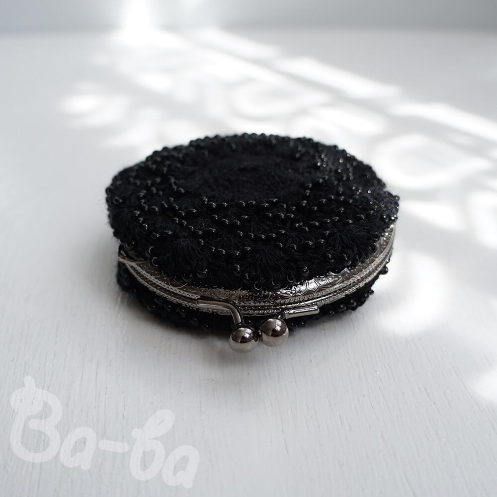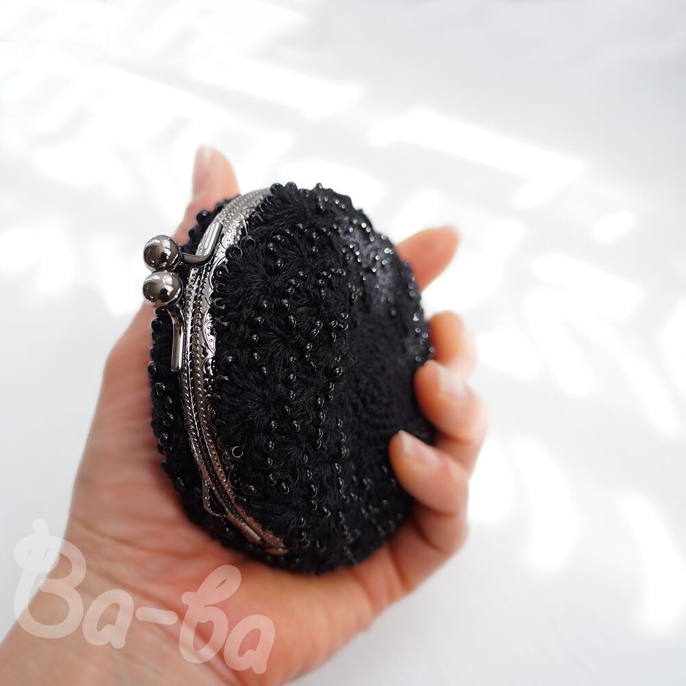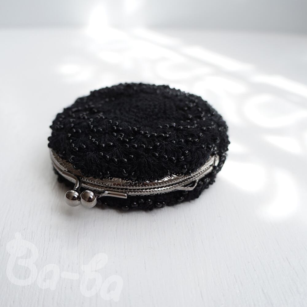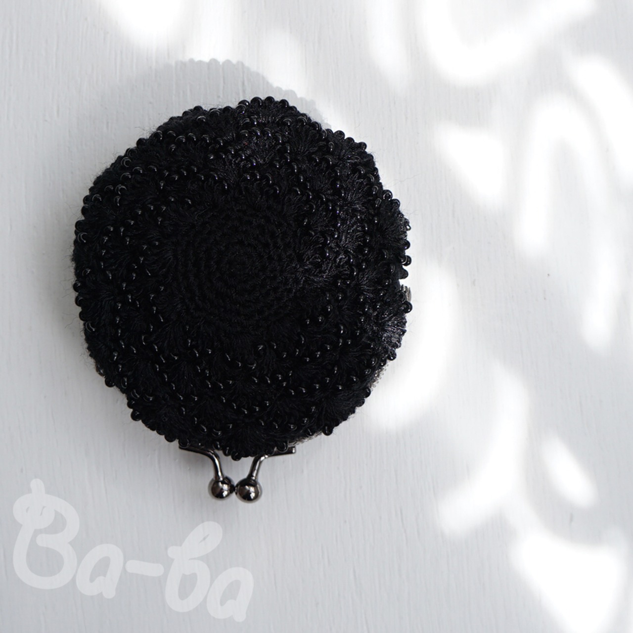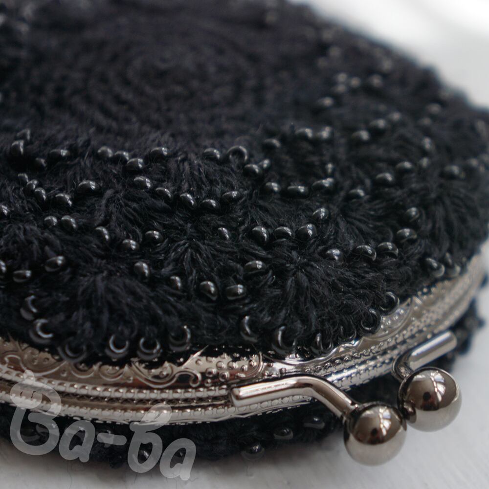 ばあば作、ビーズ入り松編み・まるまるがま口(cercle noir・C1571)