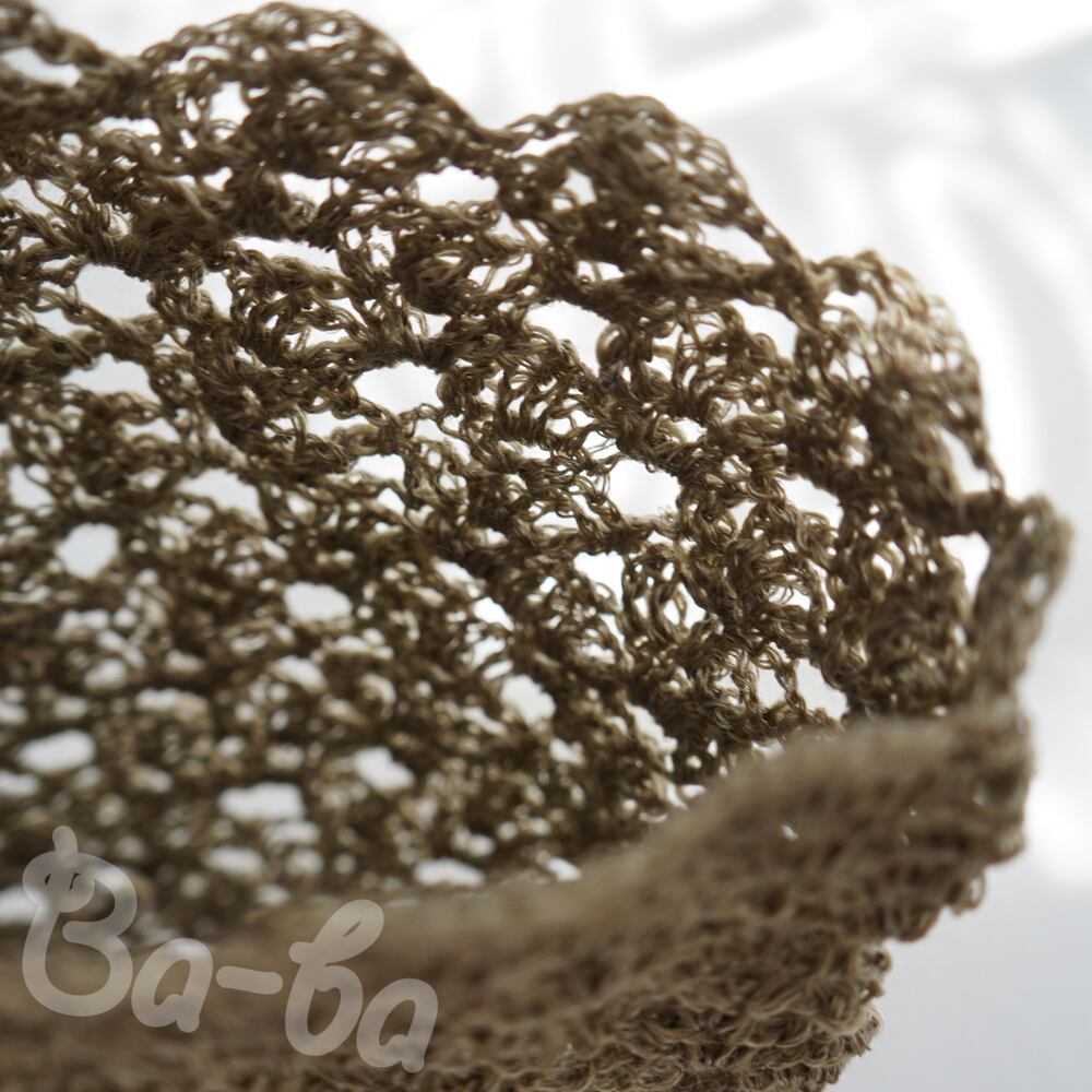 ネップ入り枯れた茶色の混紡サマーヤーンを、波模様のような透かし編みにしました。