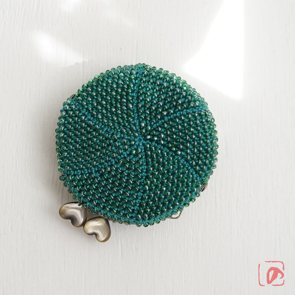 3mmのビーズをひとつぶづつ、まぁるい編み地全面に編み込みました。
