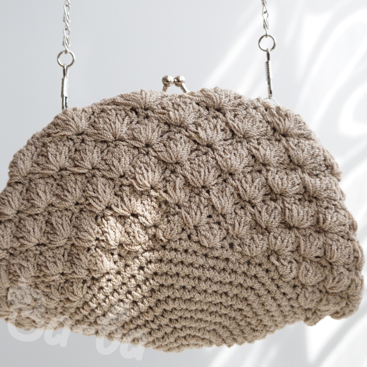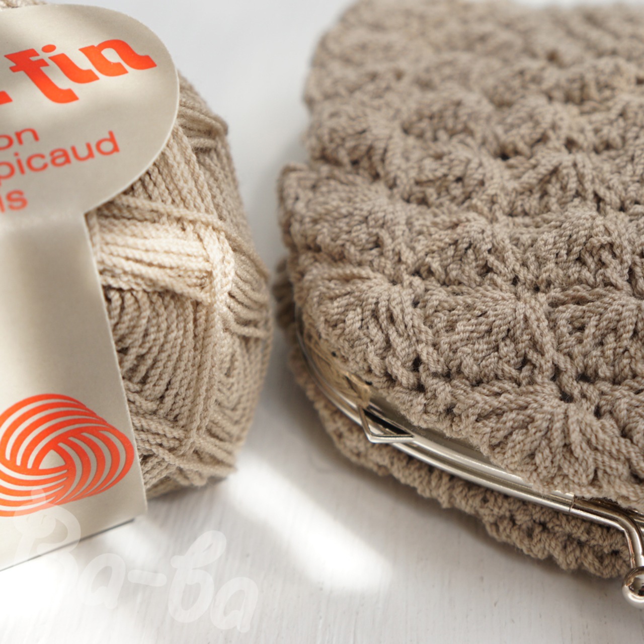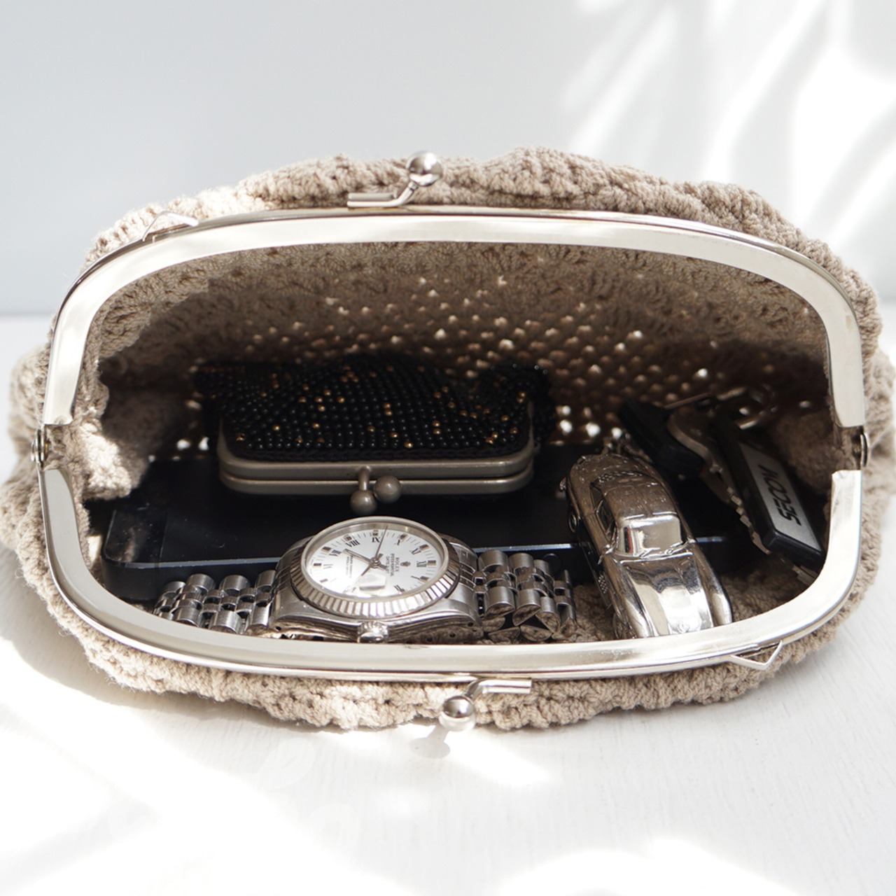 フランス製のサマーウールを松編みで編み上げ、シンプルな口金を合わせました。