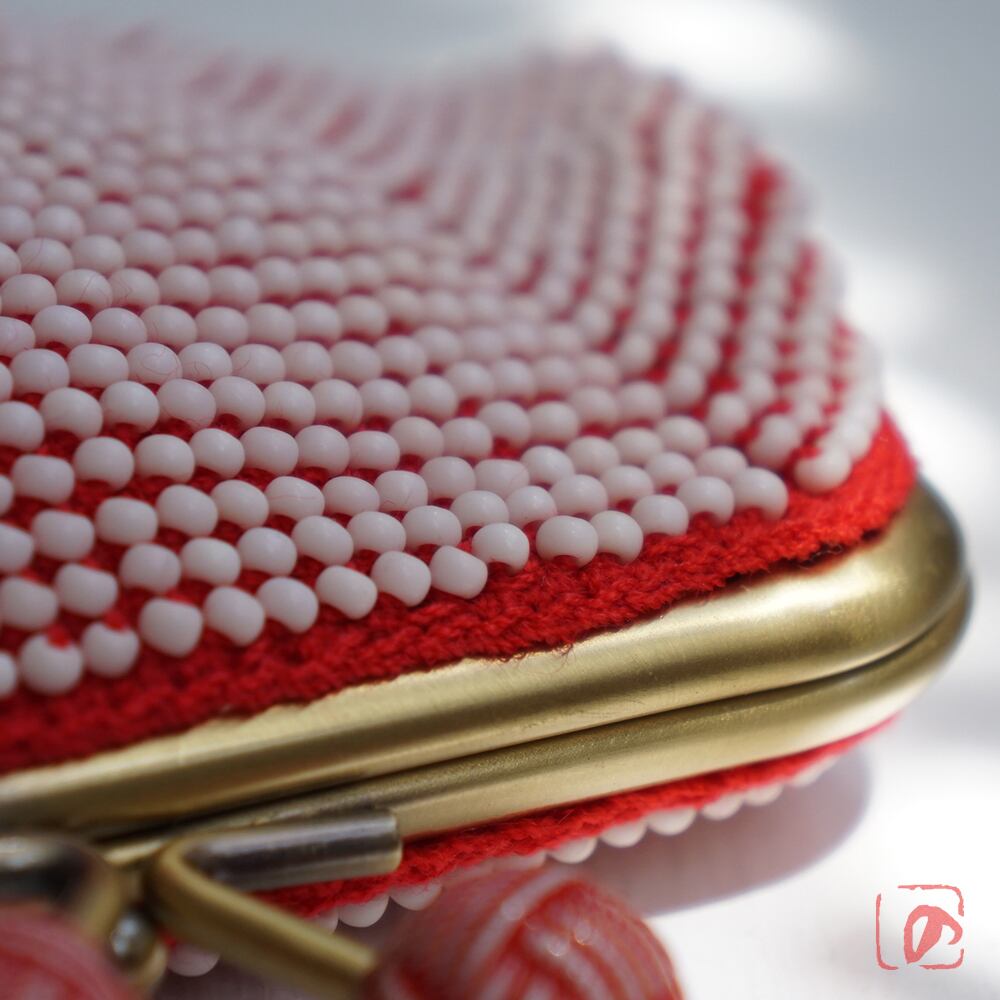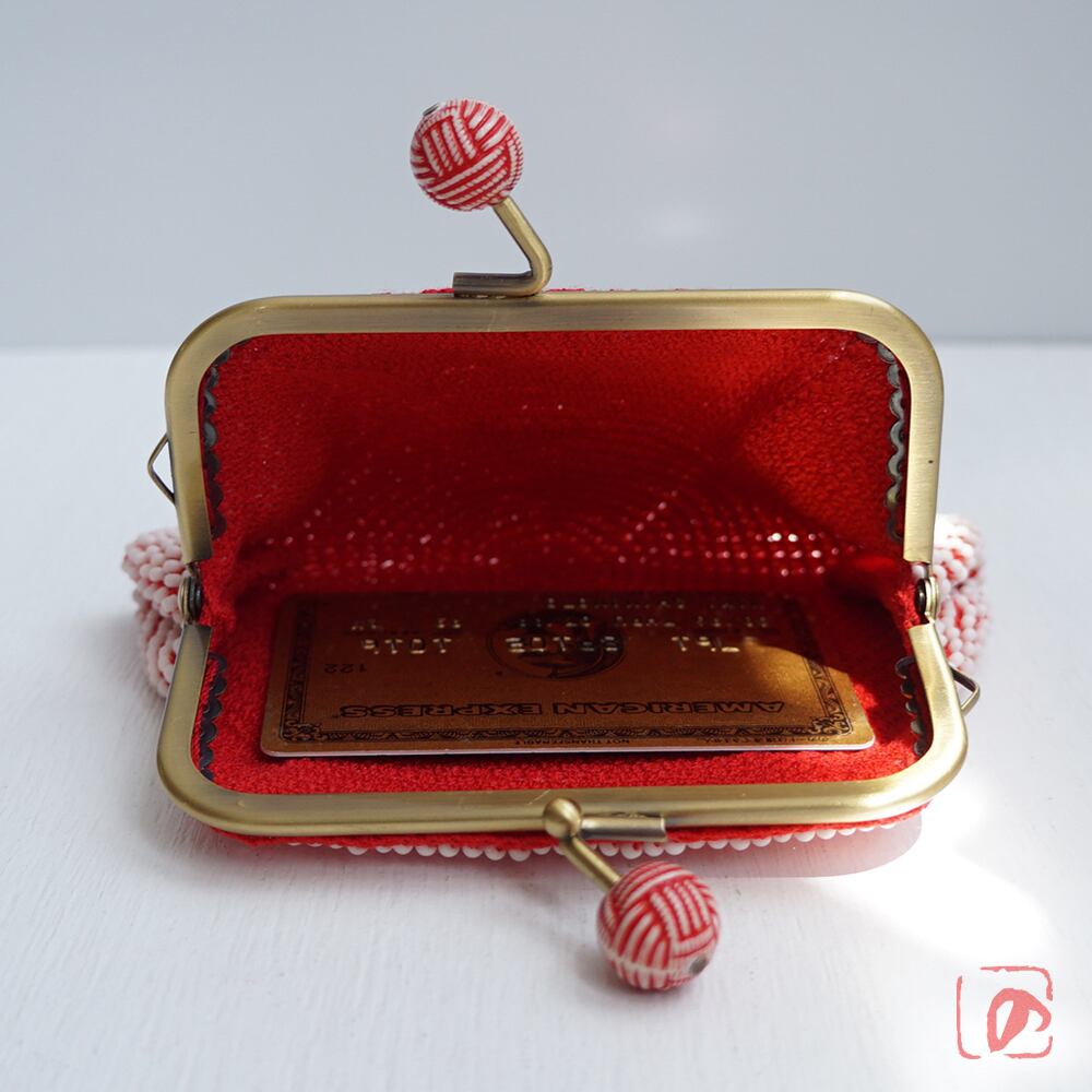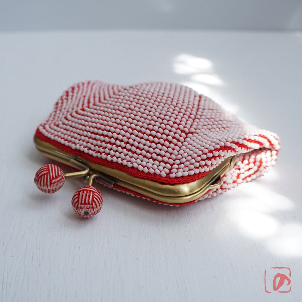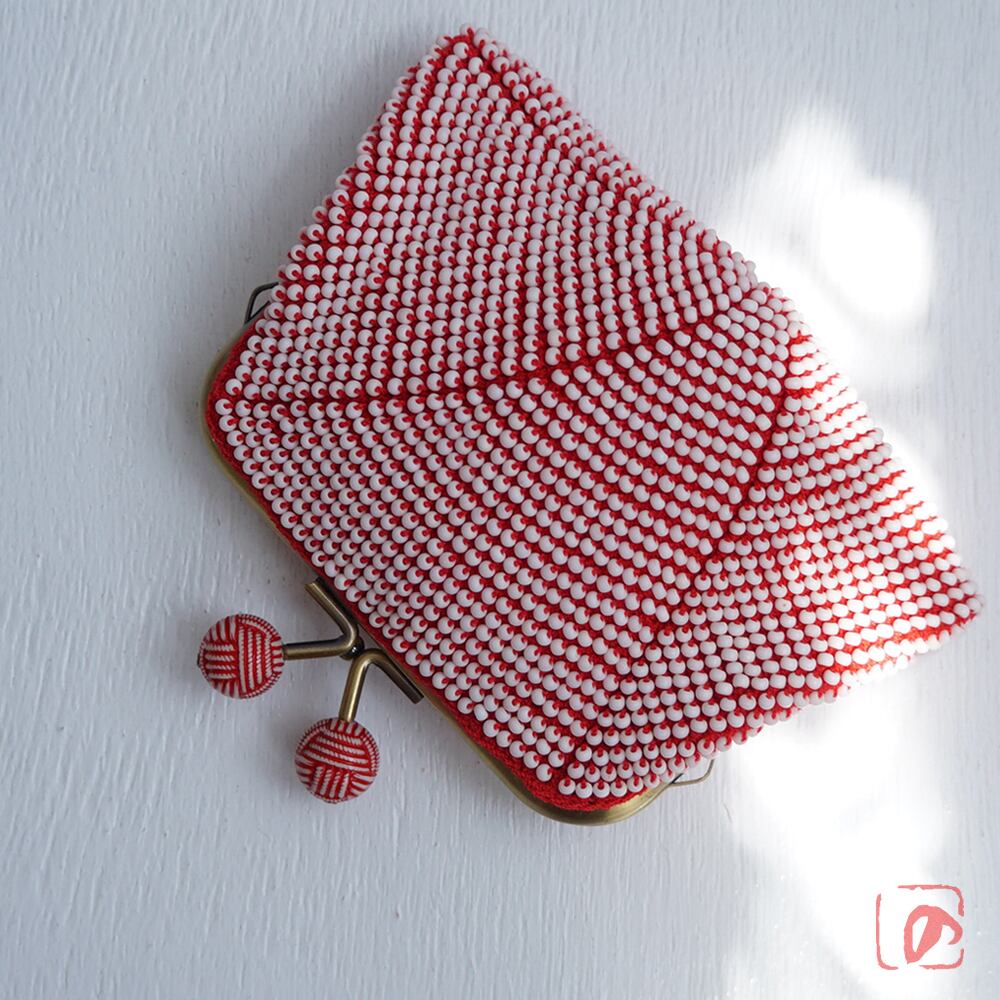 シードビーズより少し大きめの艶消しビーズをひとつぶづつ全面に編み込んだ、上質ながま口です。