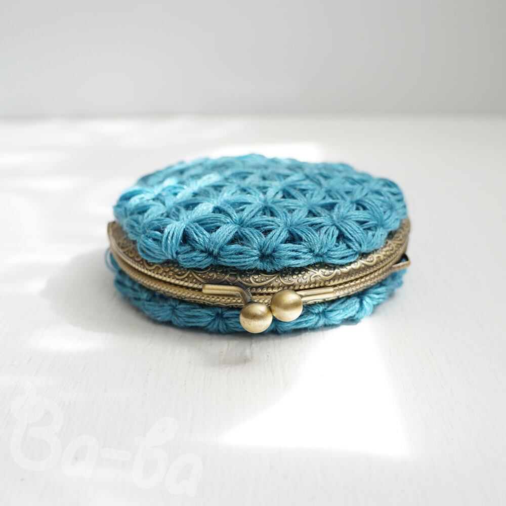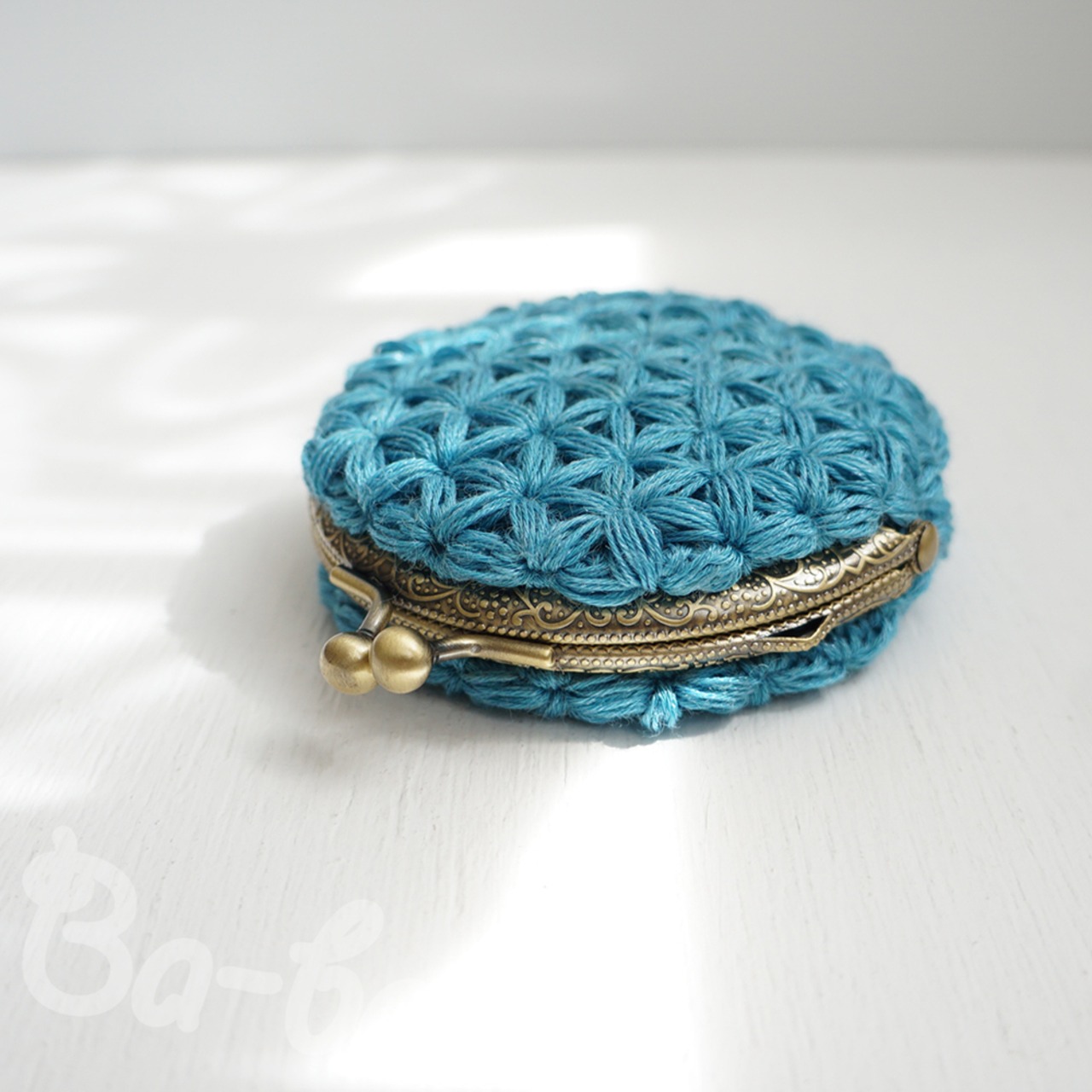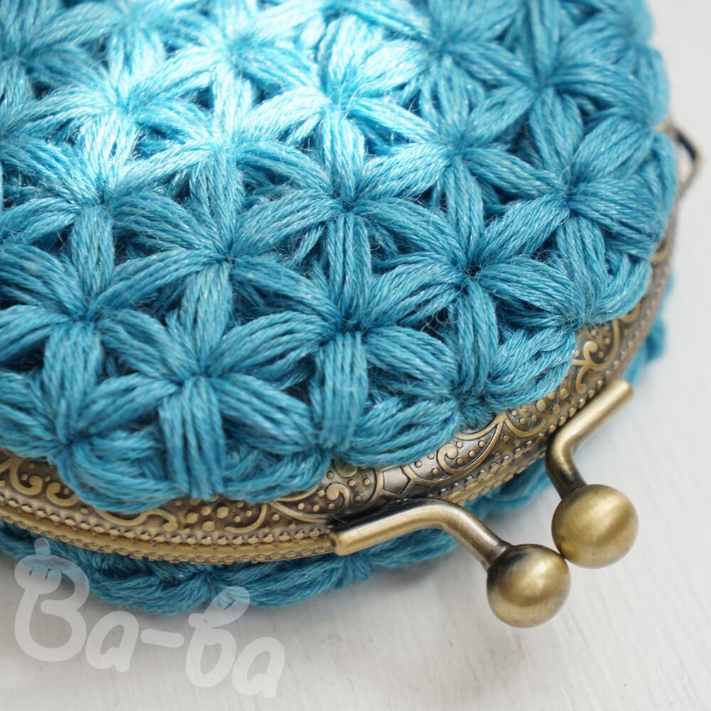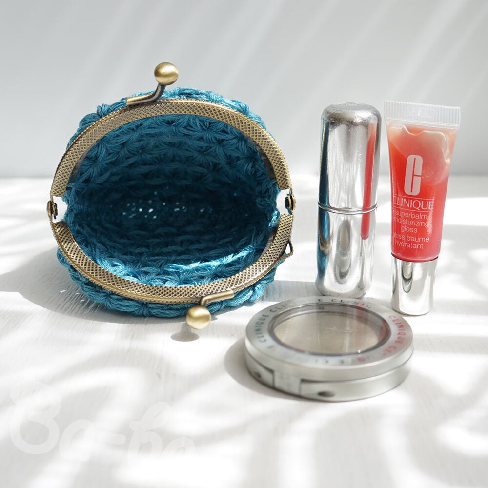 ターコイズブルーの麻混紡糸をふんわりと編み上げ、シンプルな口金と組み合わせました。