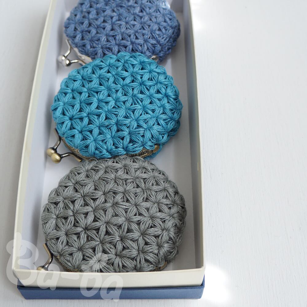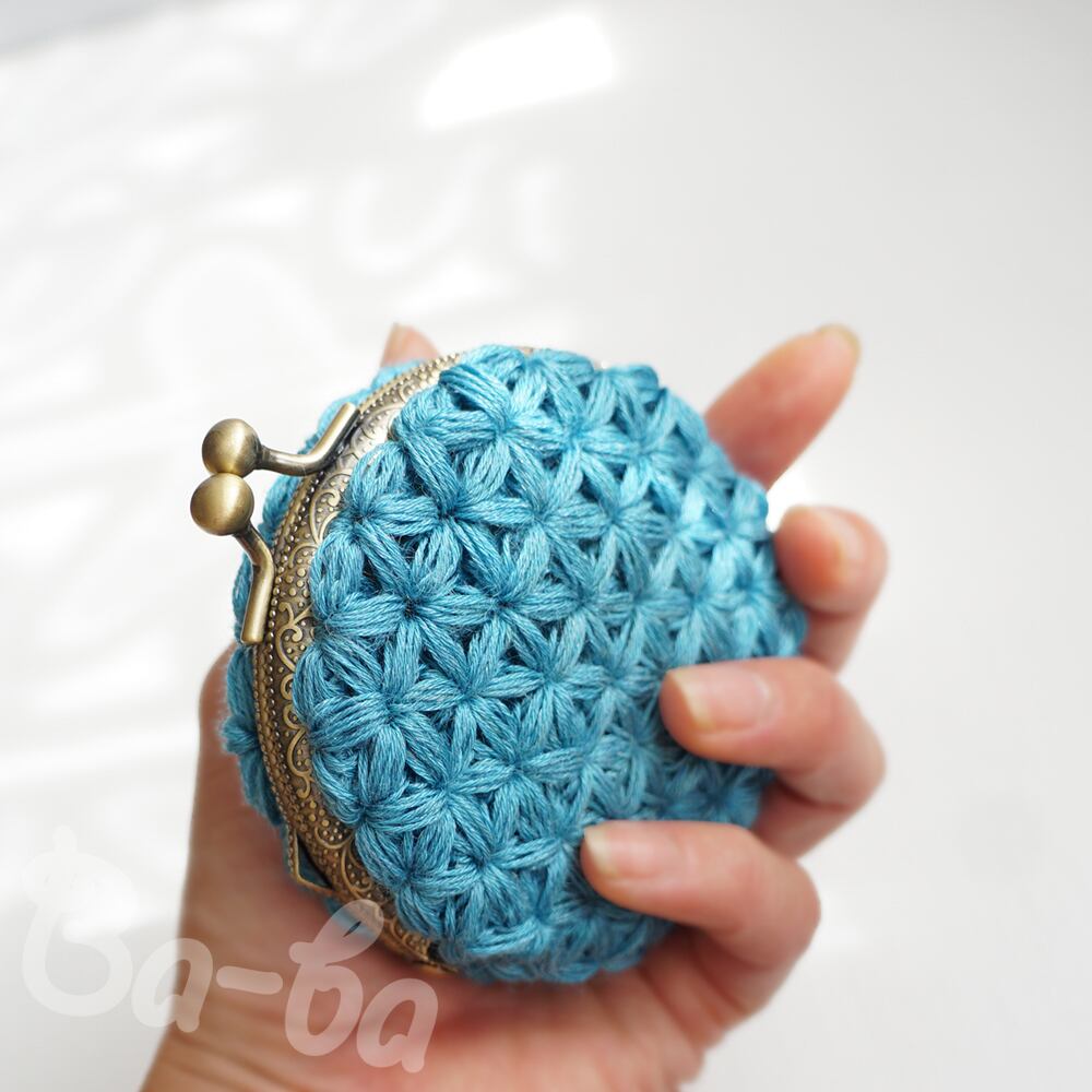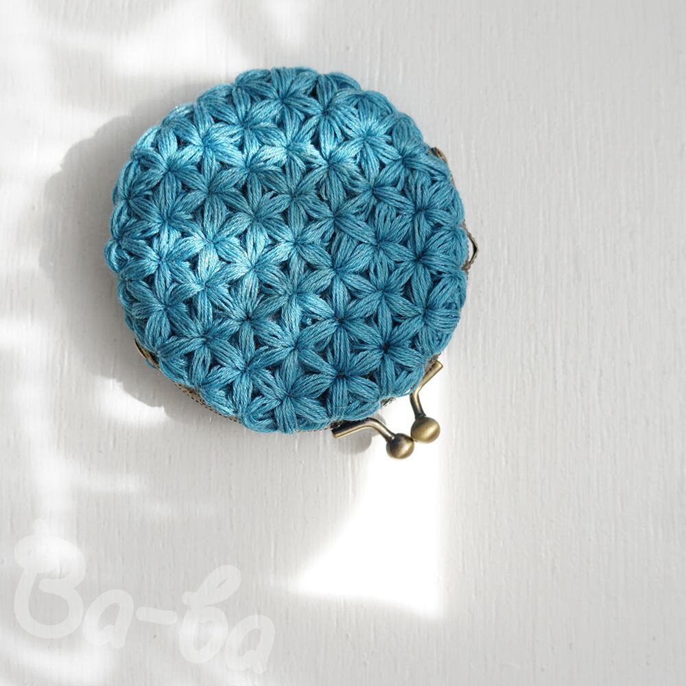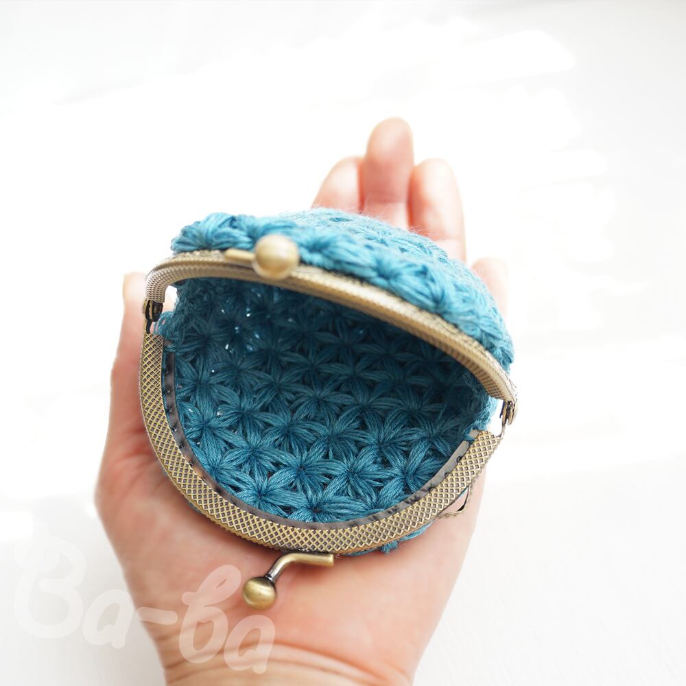 ターコイズブルーの麻混紡糸をふんわりと編み上げ、シンプルな口金と組み合わせました。