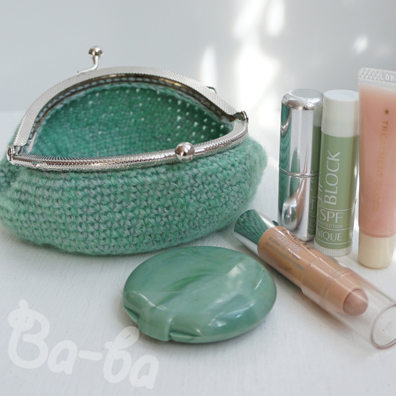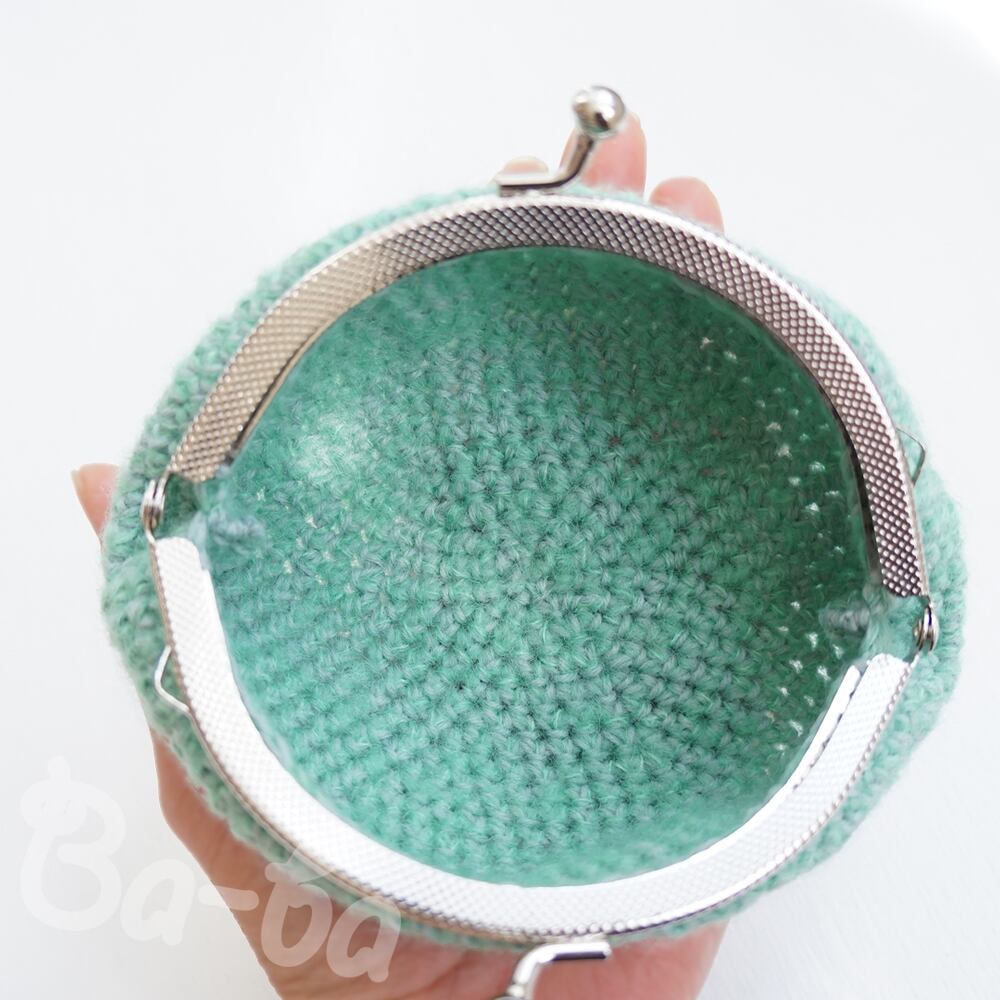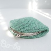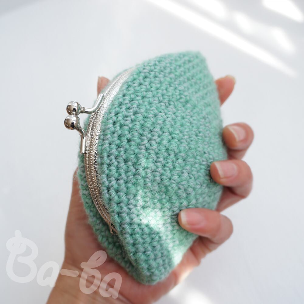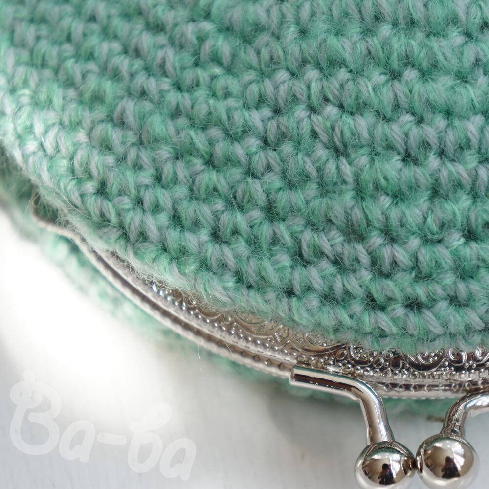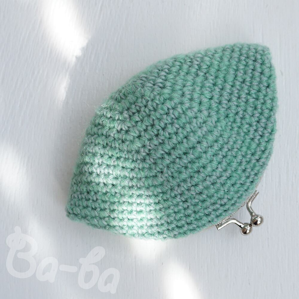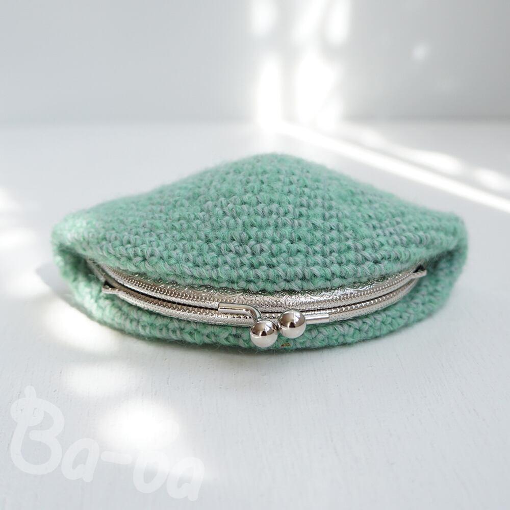 やさしいグリーンの毛糸に薄グレーを引き揃え、ふんわり軽~いがま口に仕上げました。