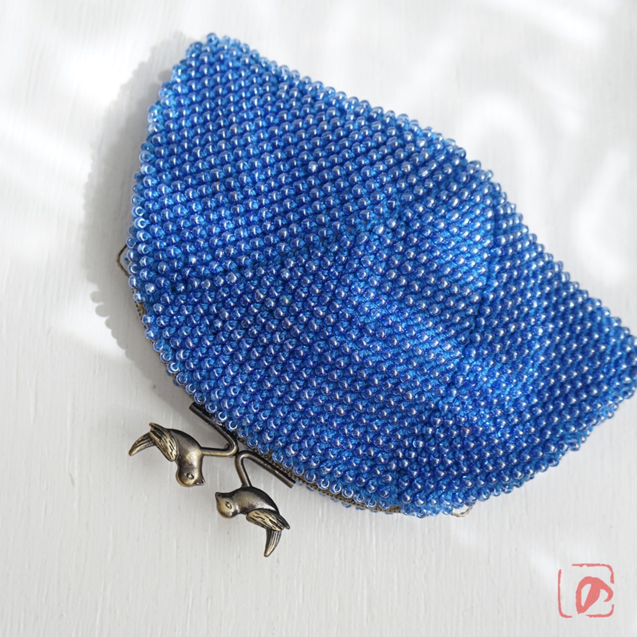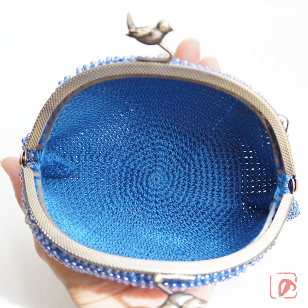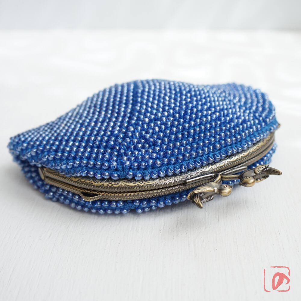 ブルーのガラスビーズの編み地と小鳥のつまみが相性ピッタリ。
