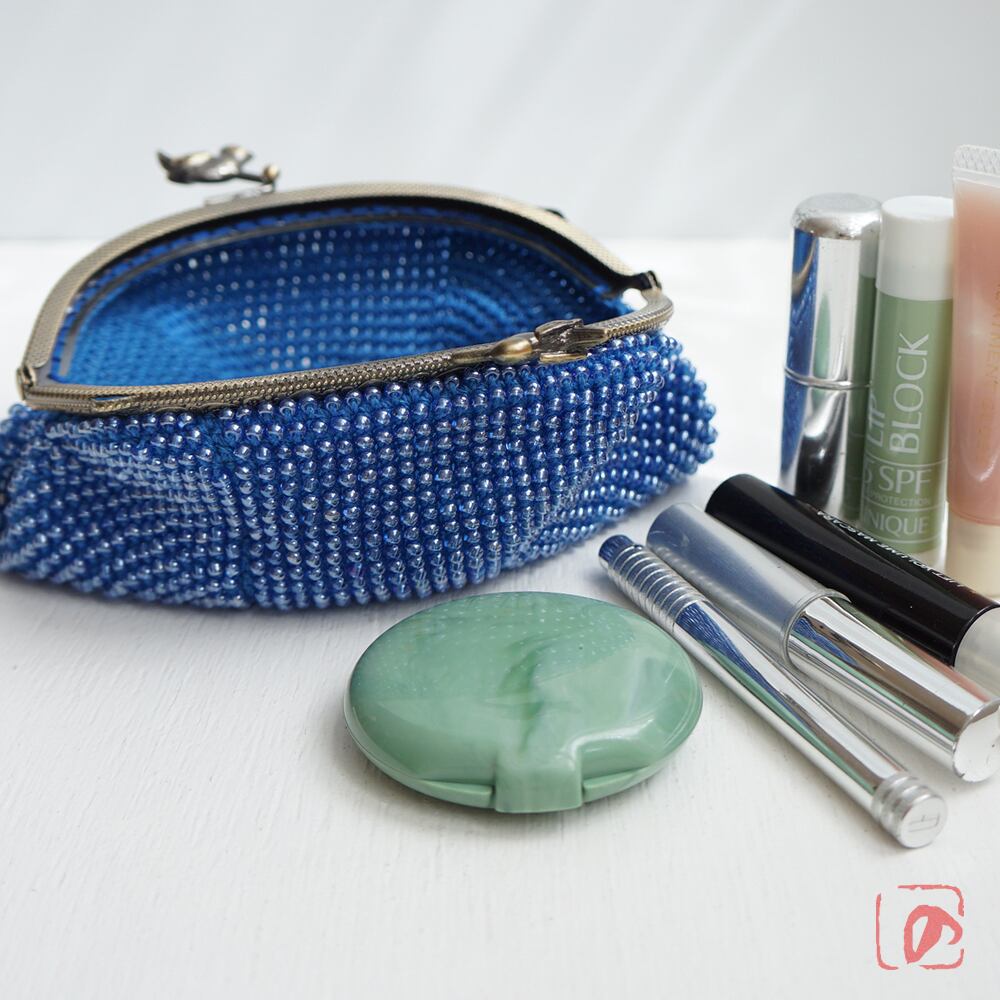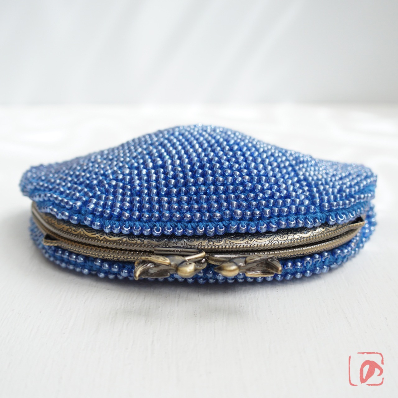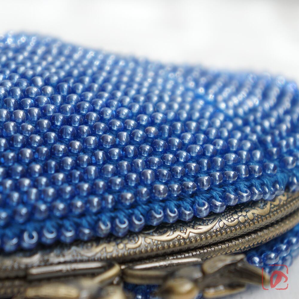 ブルーのガラスビーズの編み地と小鳥のつまみが相性ピッタリ。