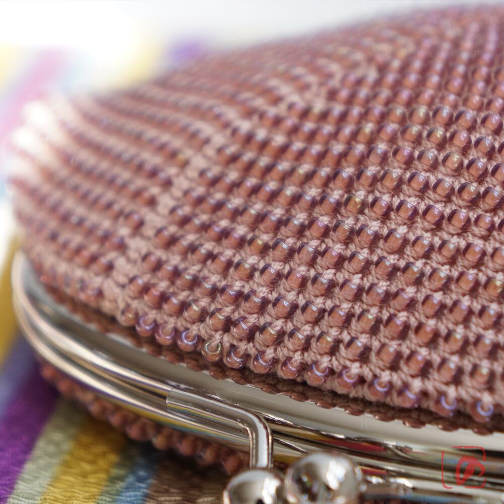 ピンクベージュの糸に同色ピンクのビーズ、上品でシックな編み地です。