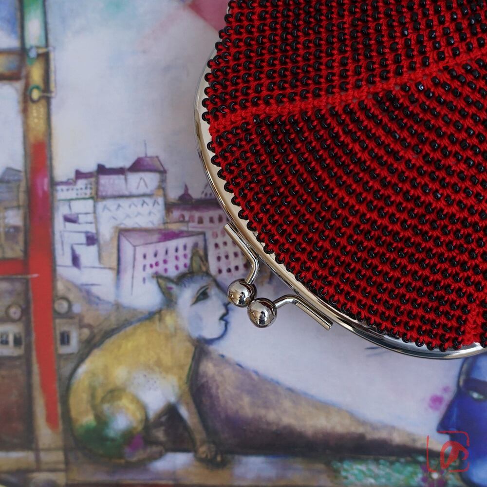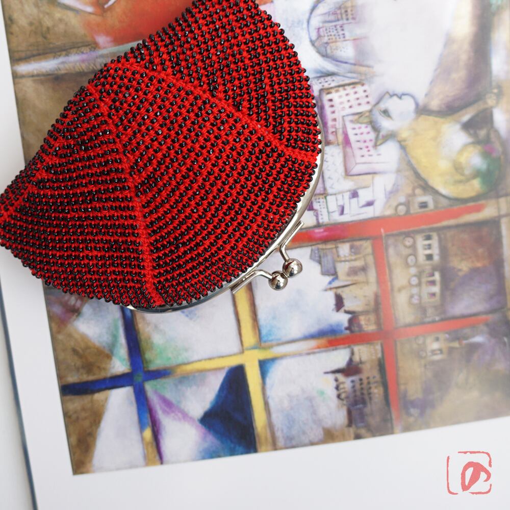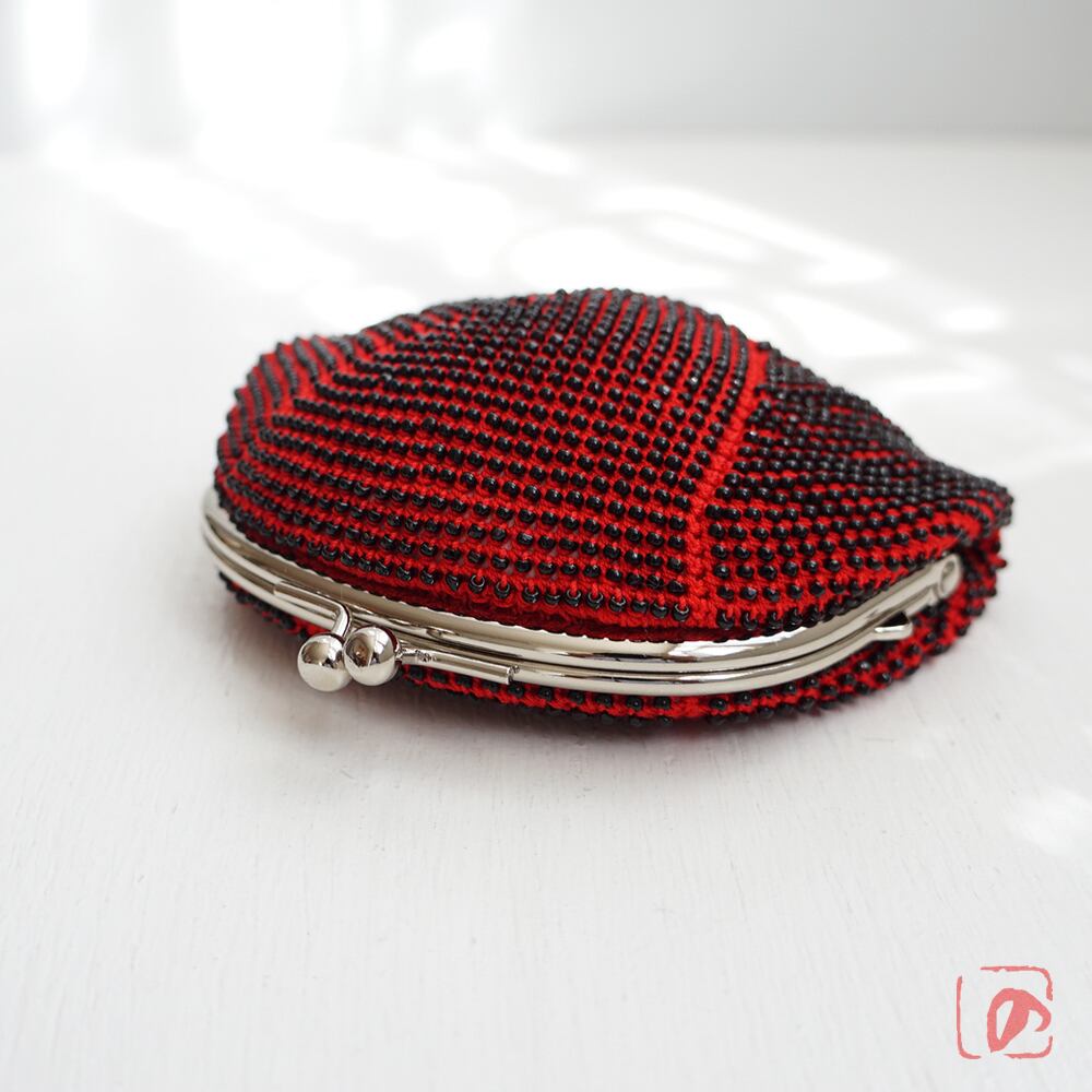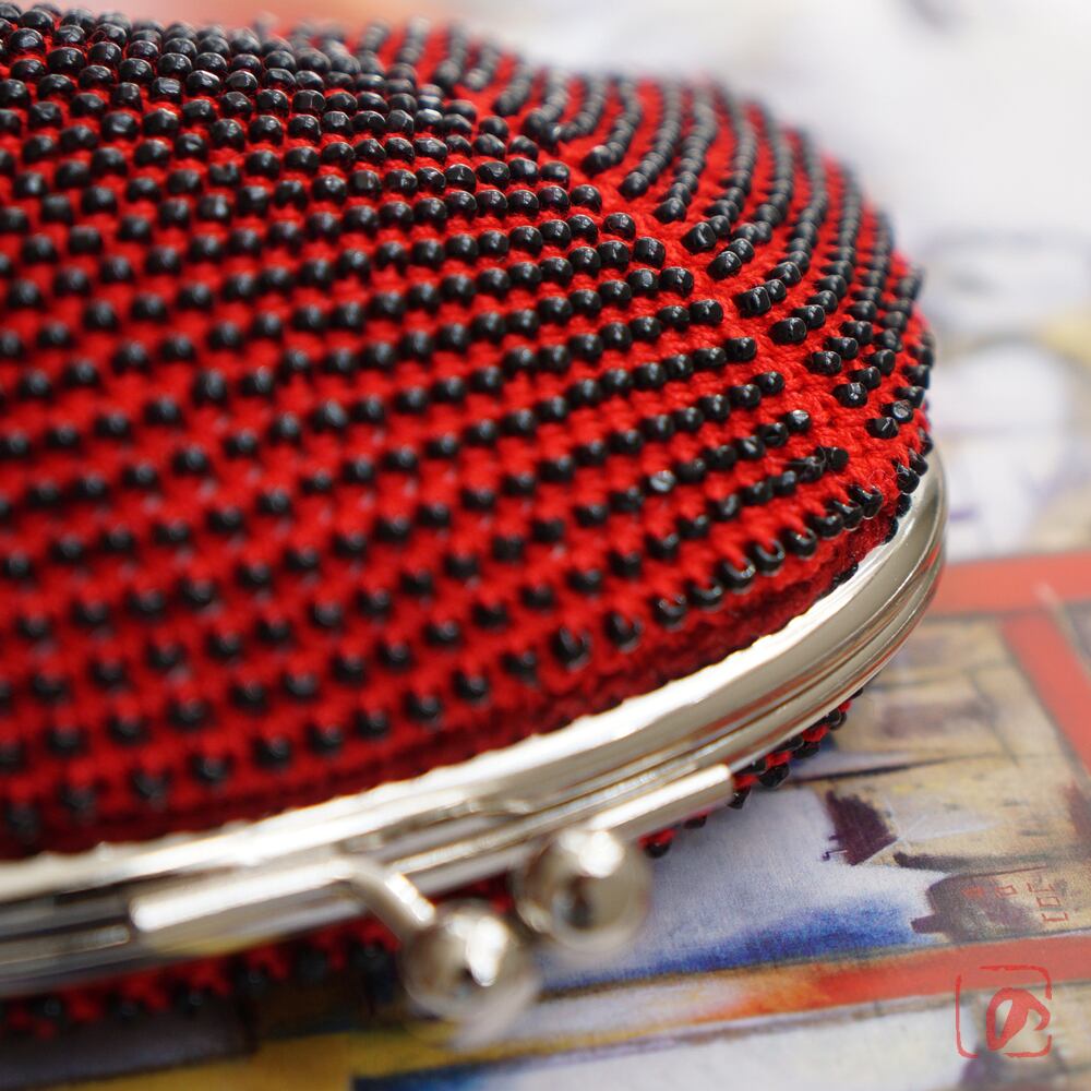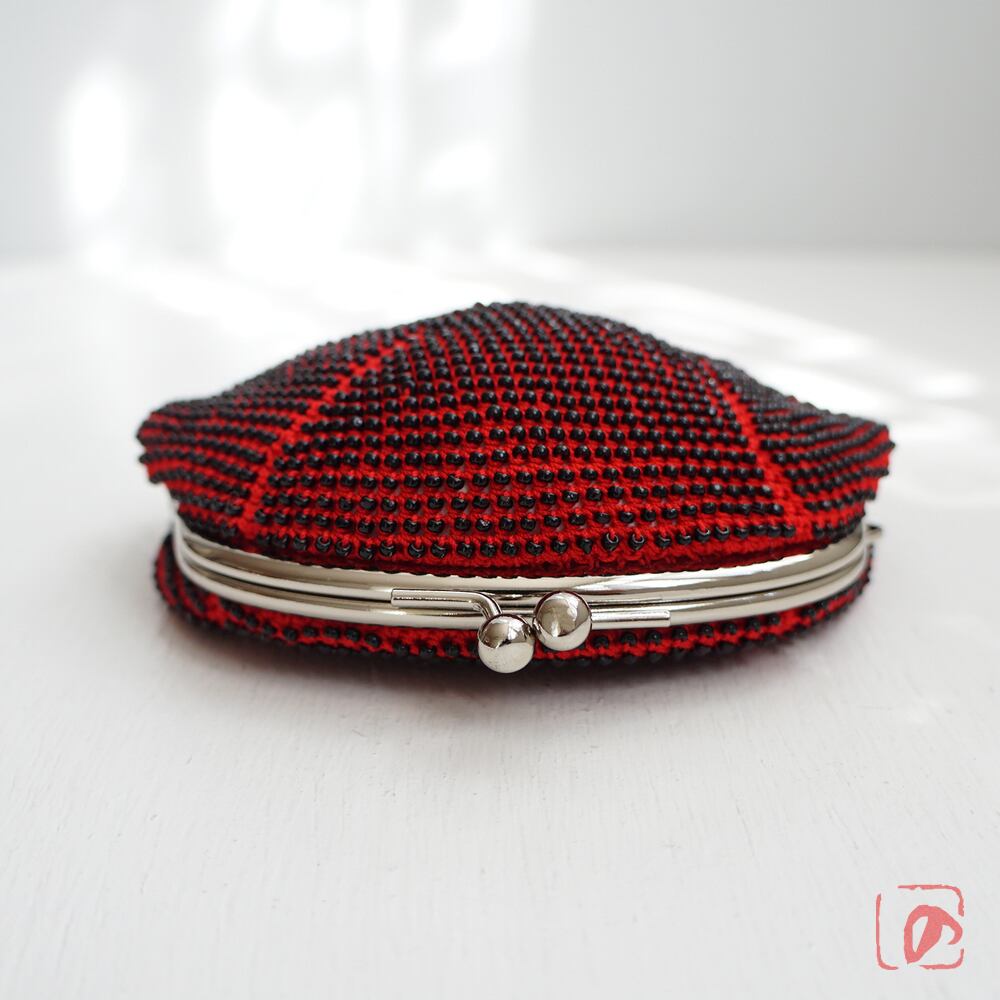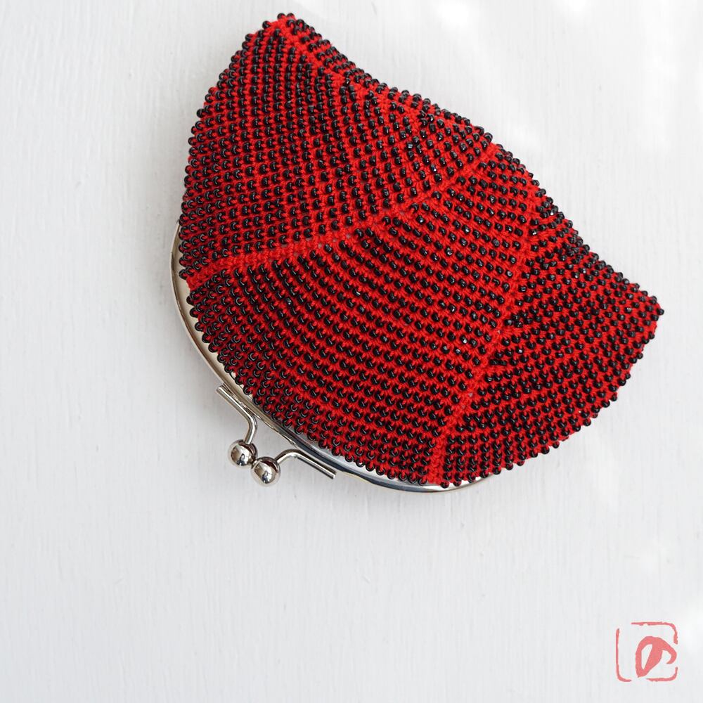 真っ赤な糸に黒いシードビーズを編み込んだレトロな感じの編み地、