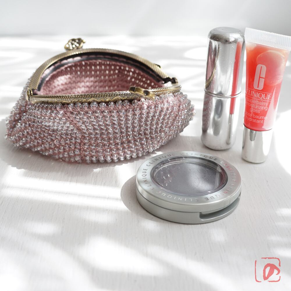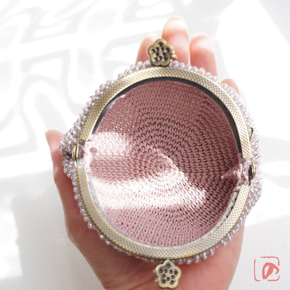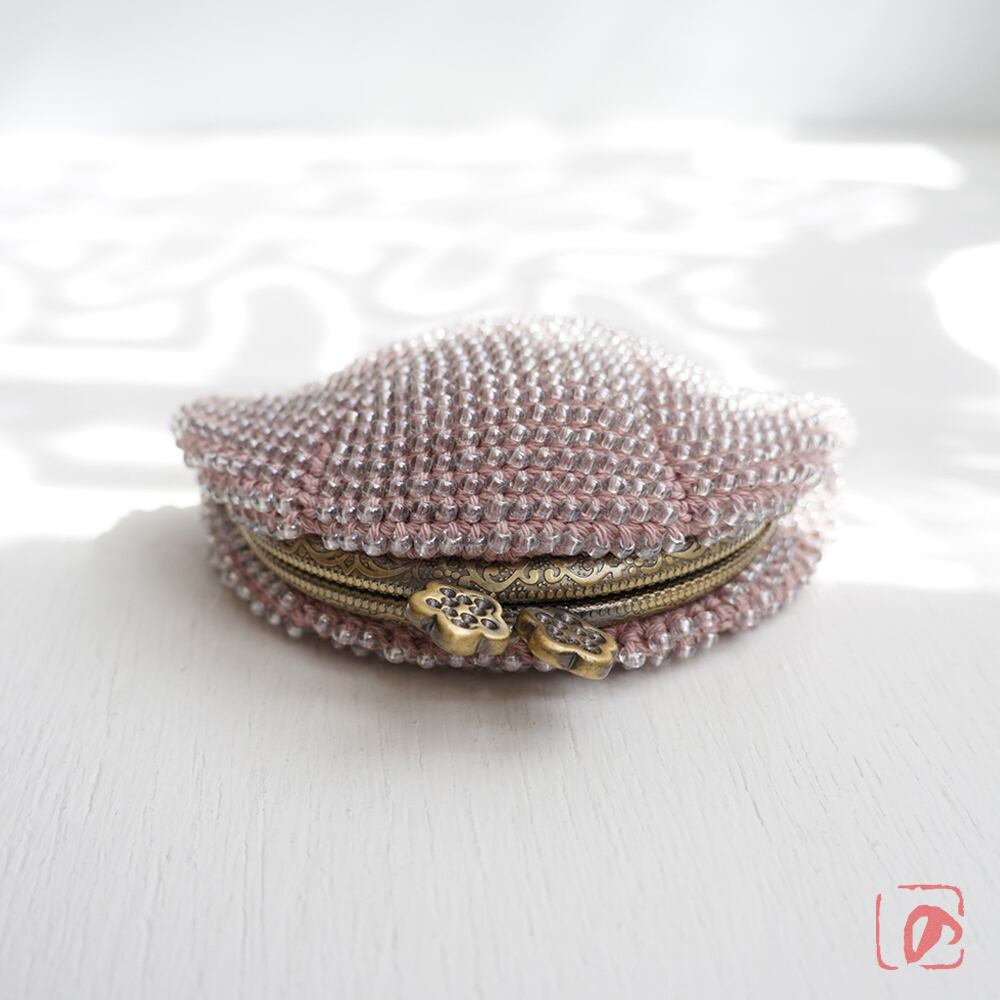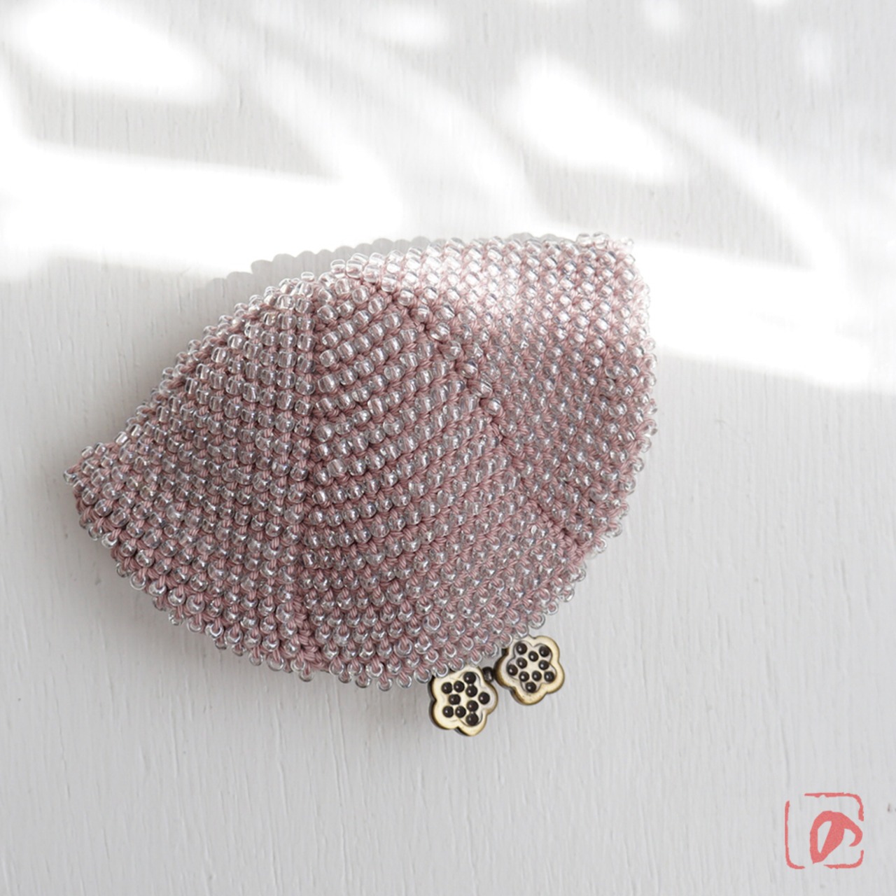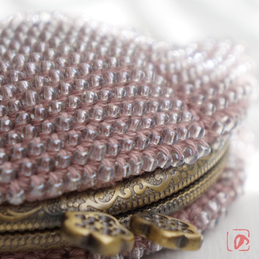クリアビーズをくすみピンクの糸に通した編み地で、シックな雰囲気に仕上げました。