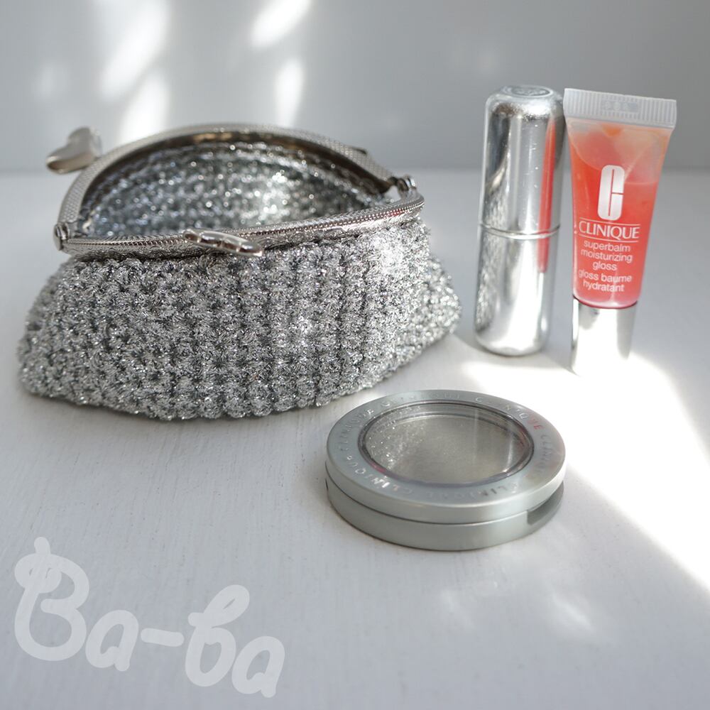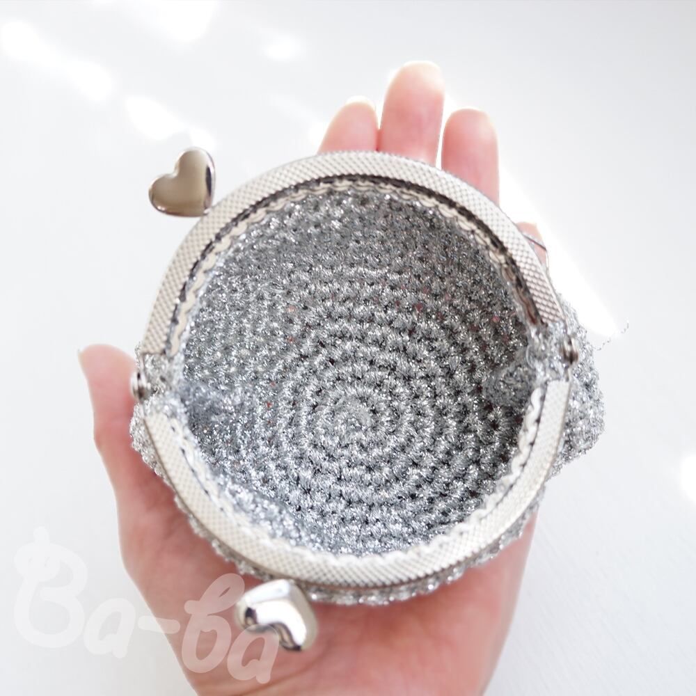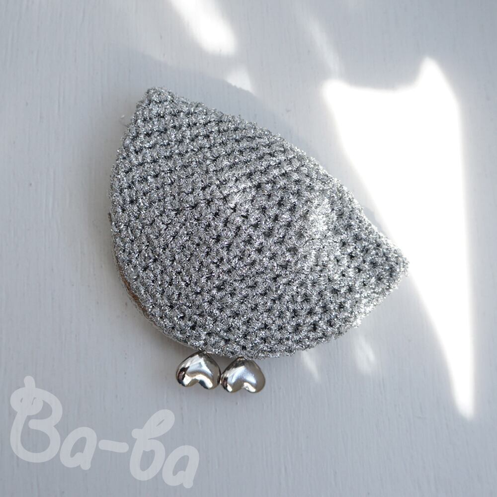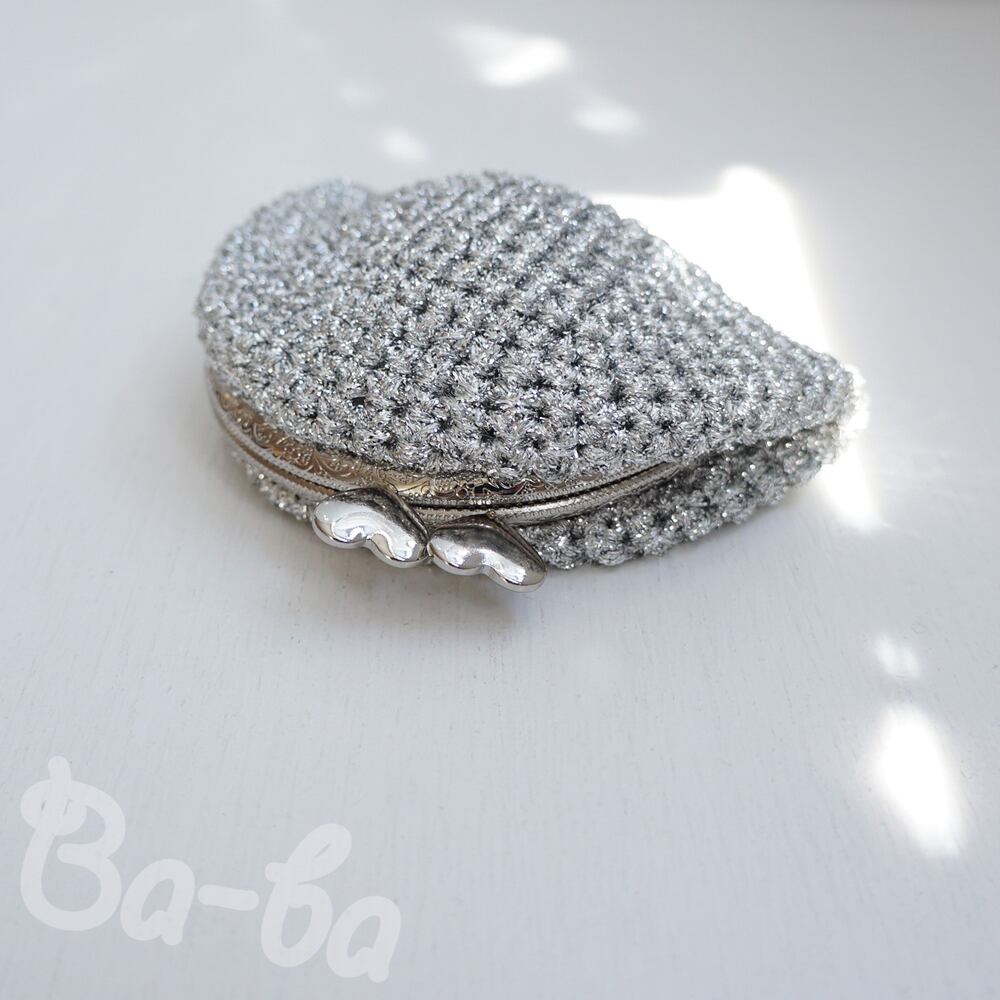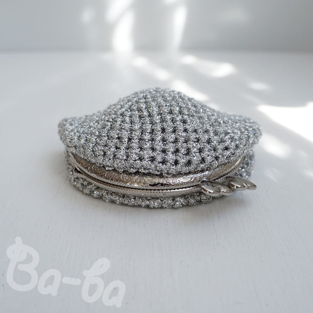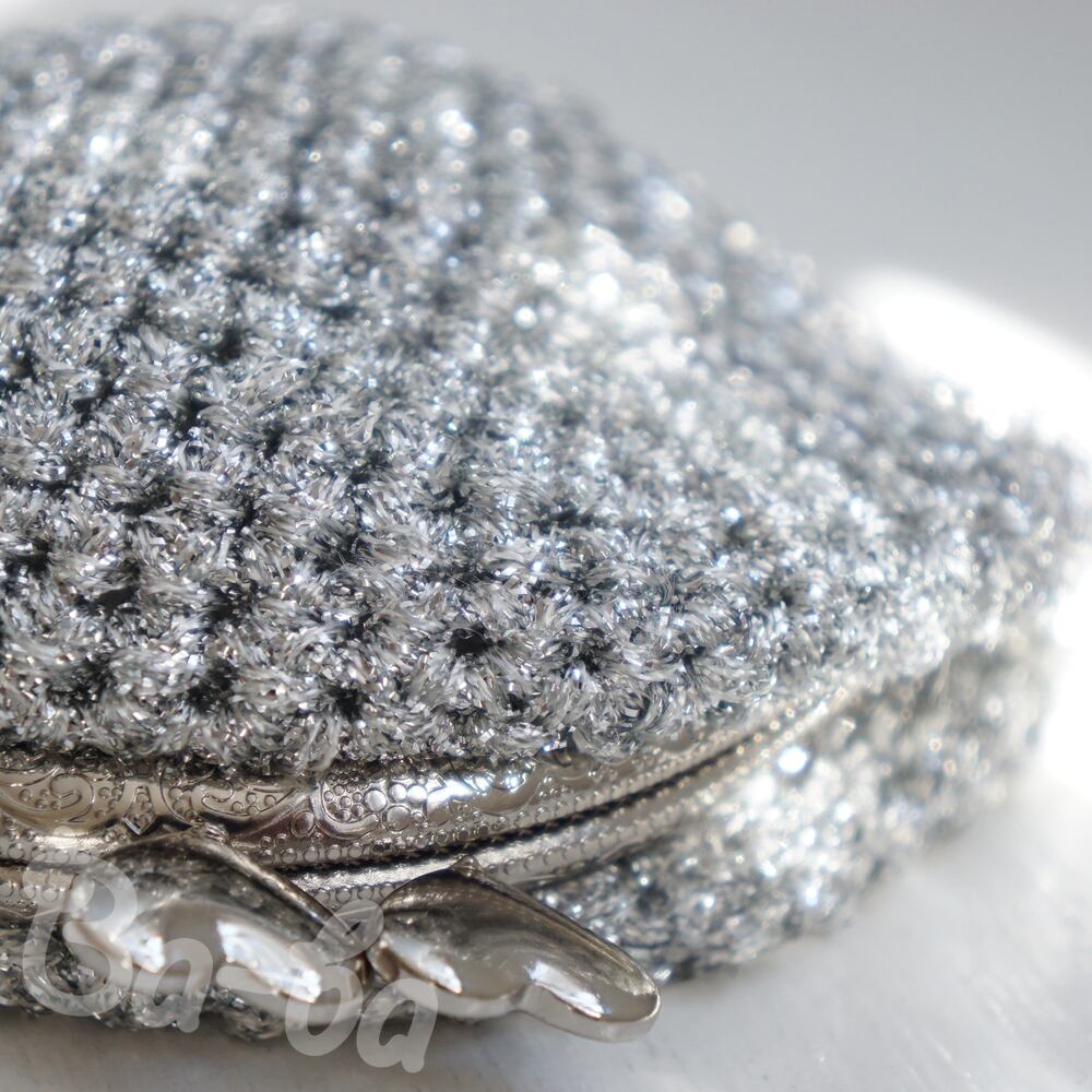 シルバーのフランス製糸の編み地に同じくシルバーの口金を合わせた、キラキラのがま口です。