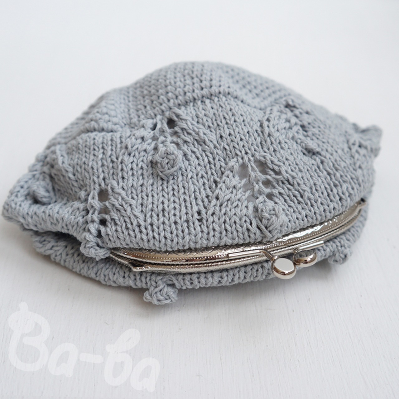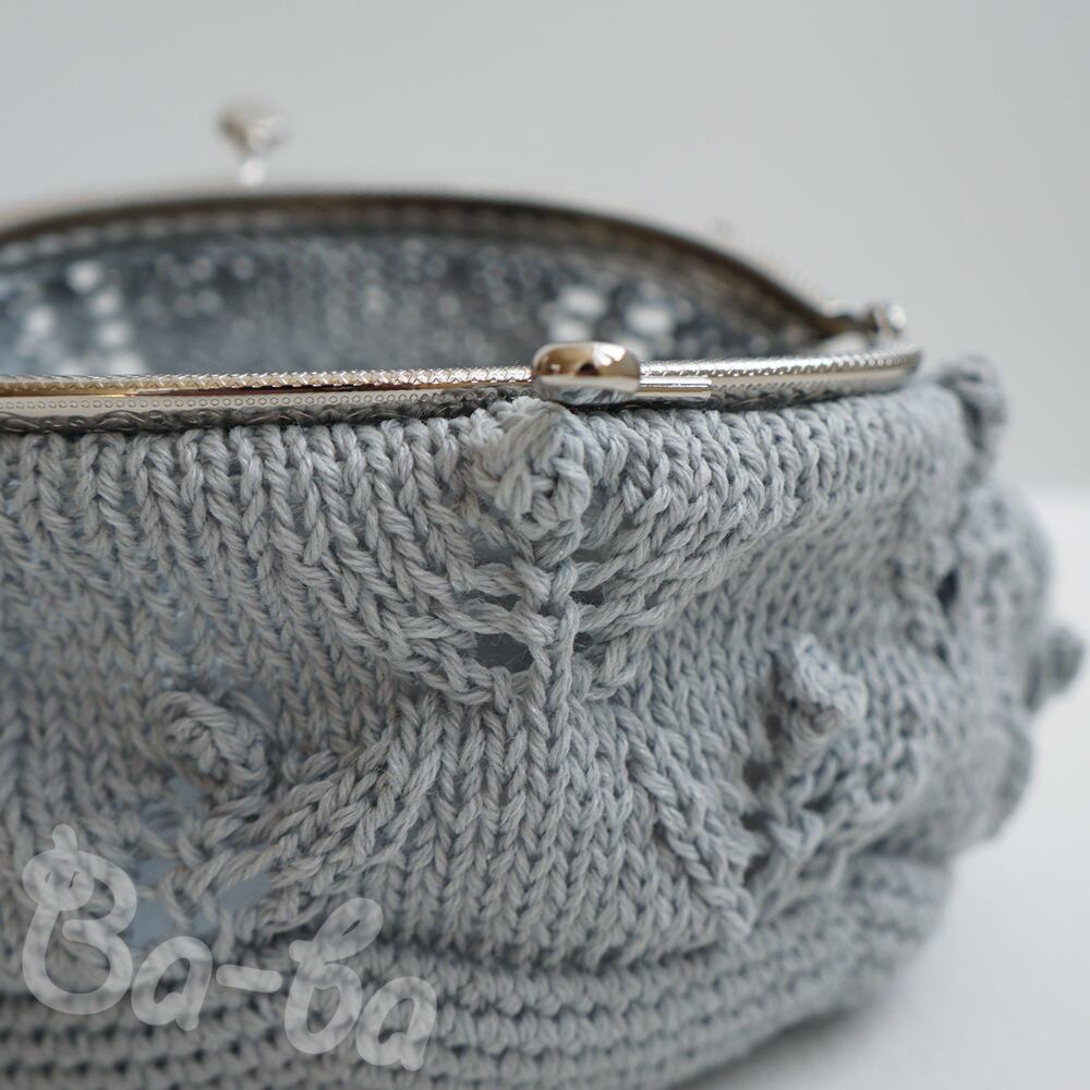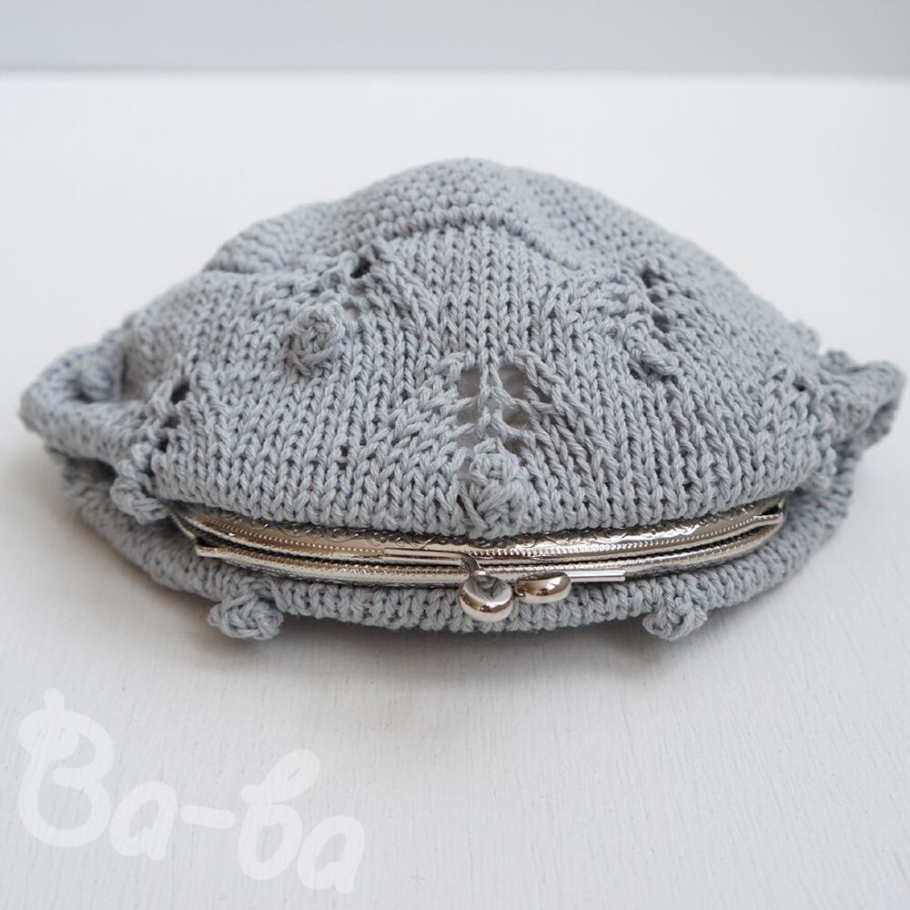 ライトグレーの糸を透かし模様で編み上げ、がま口に仕上げました。