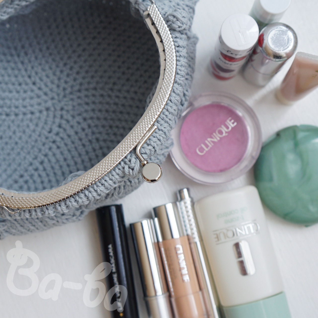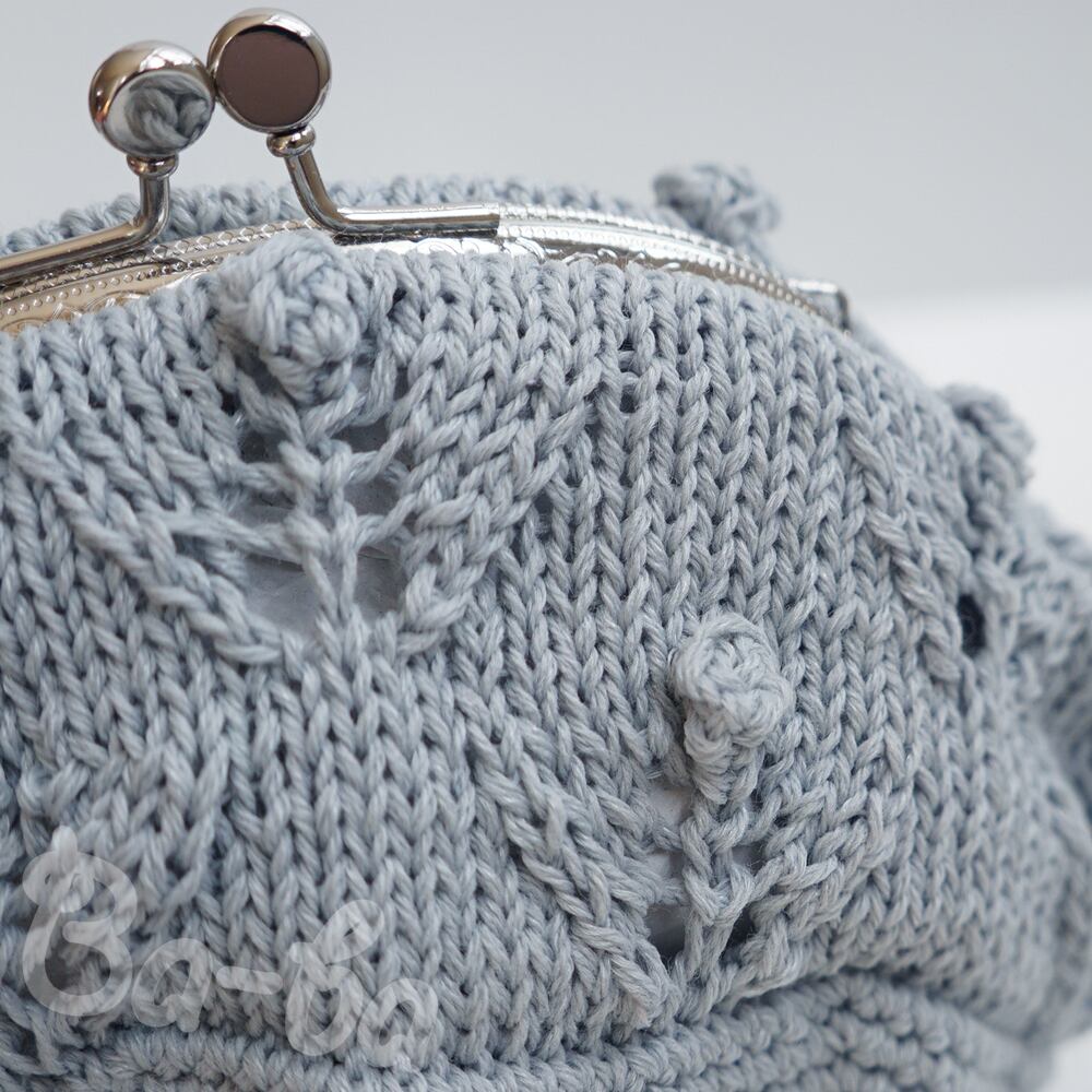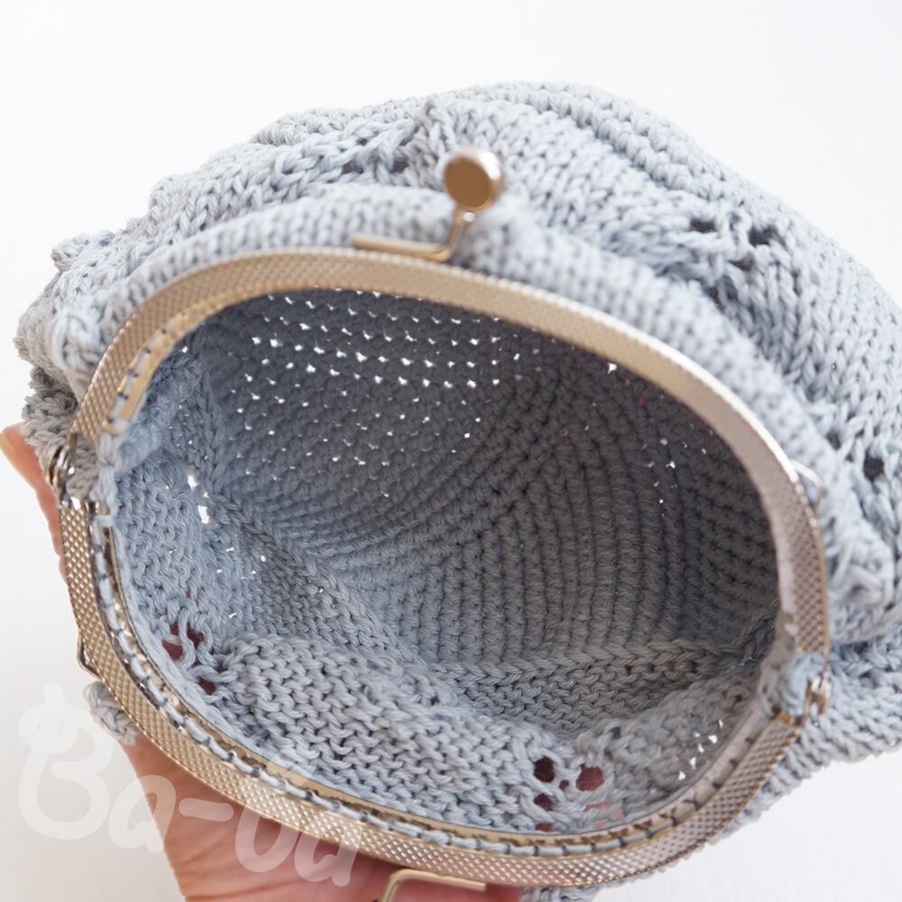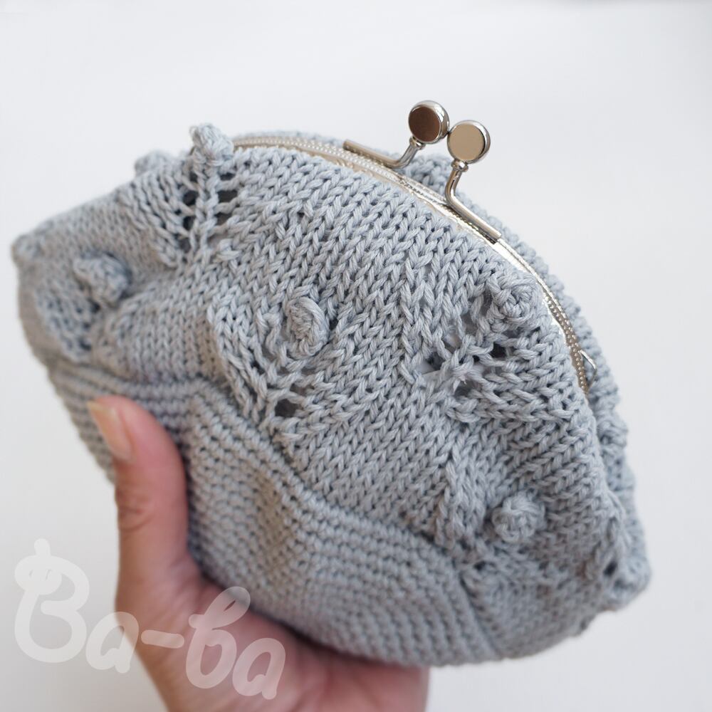 ライトグレーの糸を透かし模様で編み上げ、がま口に仕上げました。