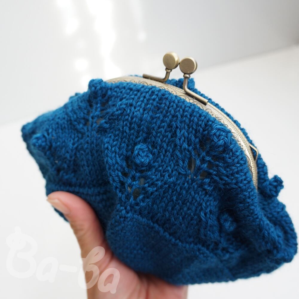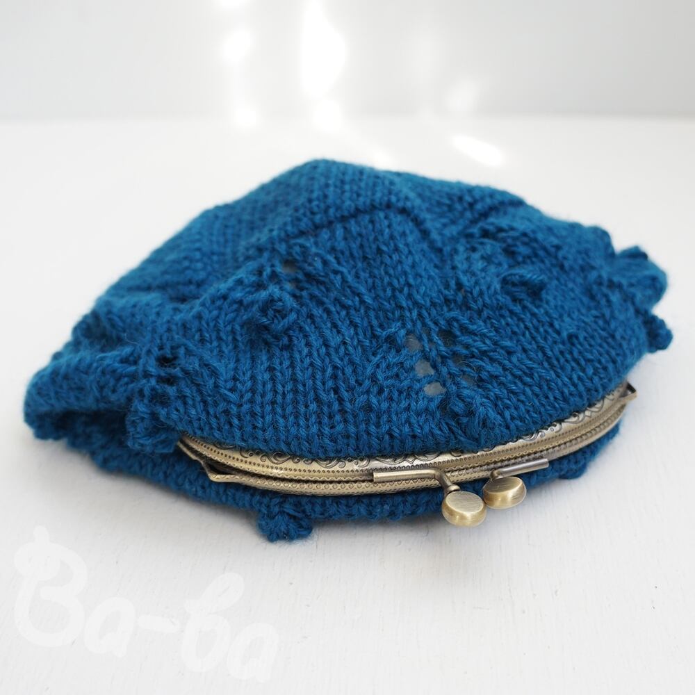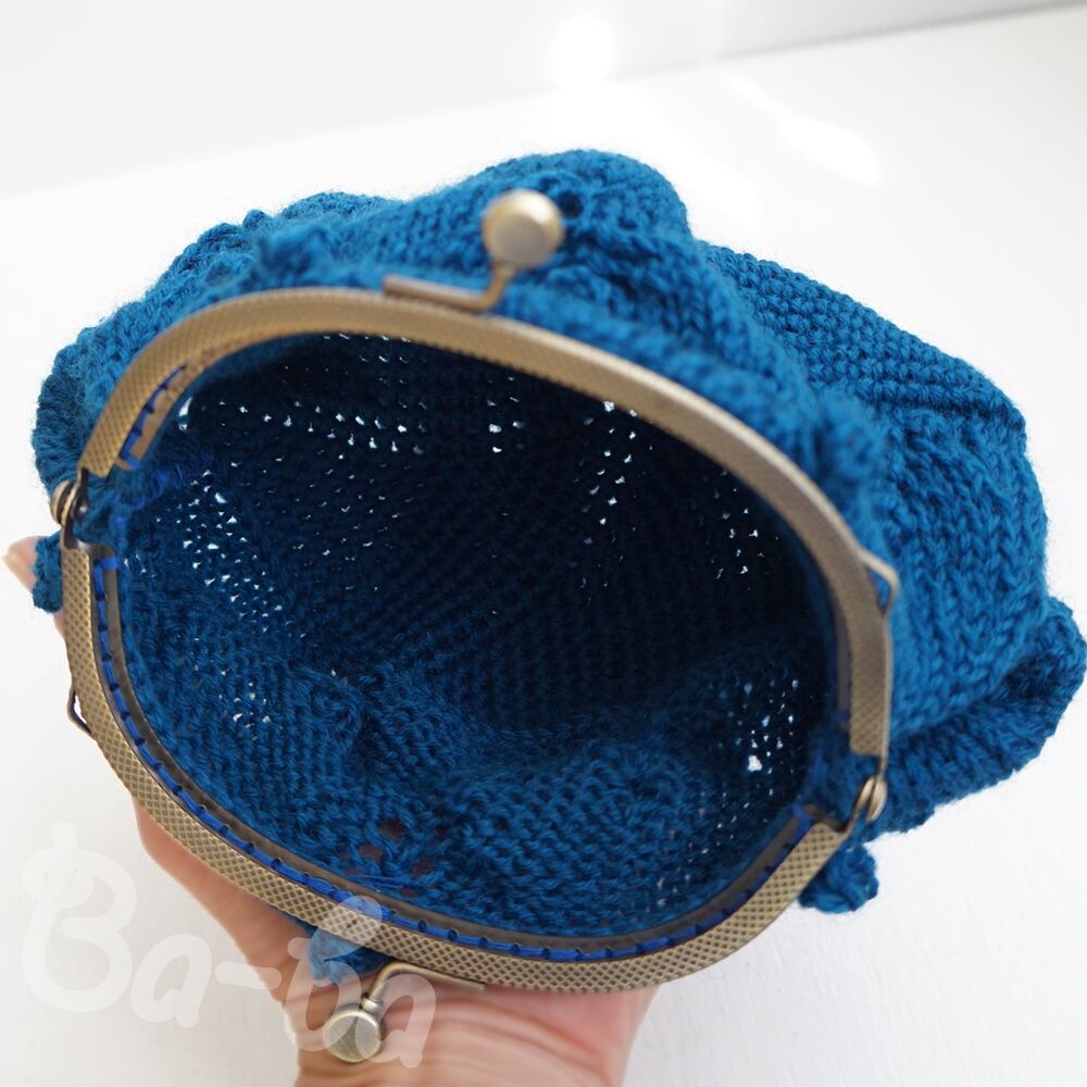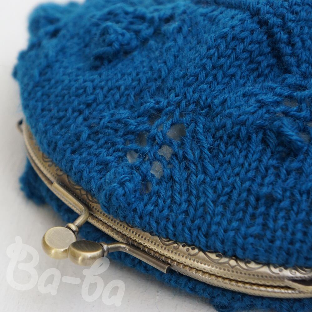 ブルーのやわらかな手触りのフランス製毛糸を透かし編みで編み上げ、がま口に仕上げました。