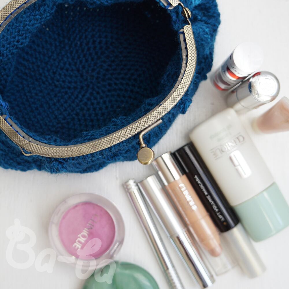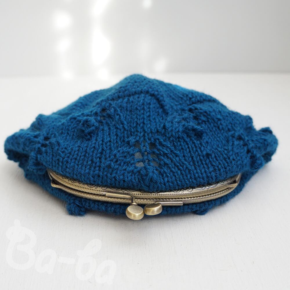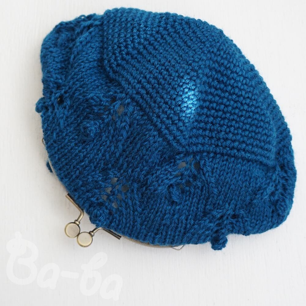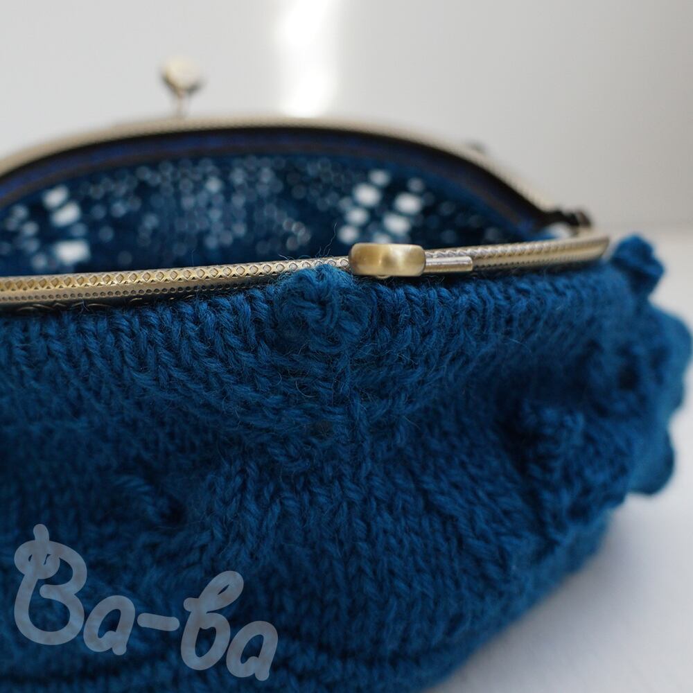 ブルーのやわらかな手触りのフランス製毛糸を透かし編みで編み上げ、がま口に仕上げました。