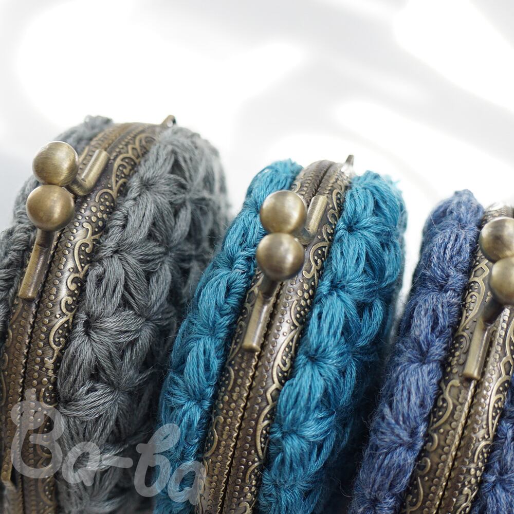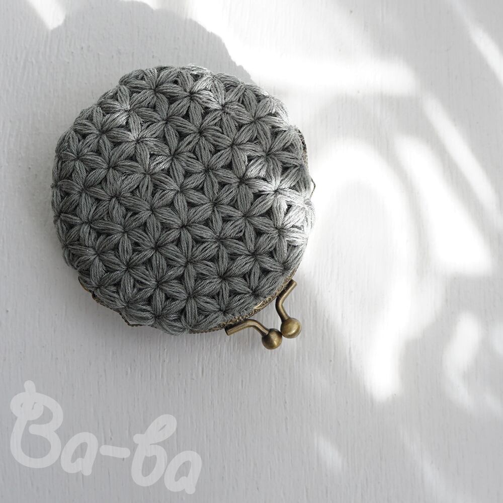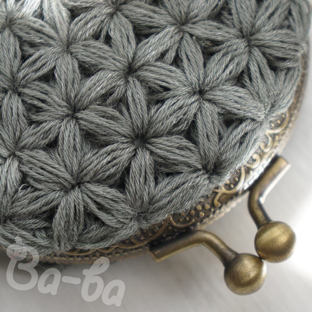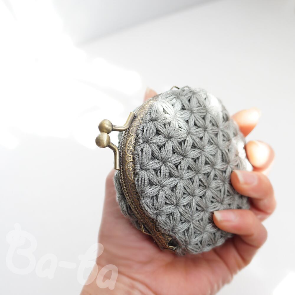 グレーの麻混紡糸をふんわりと編み上げ、シンプルな口金と組み合わせました。