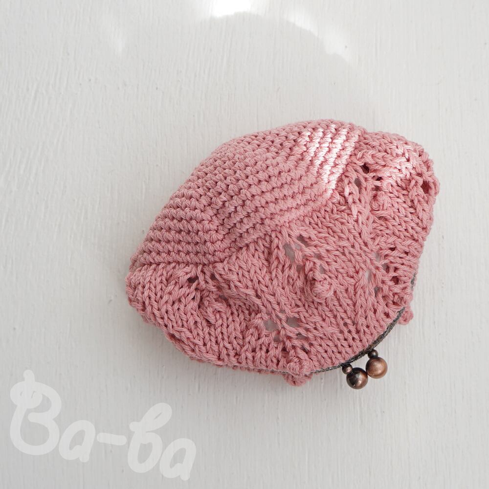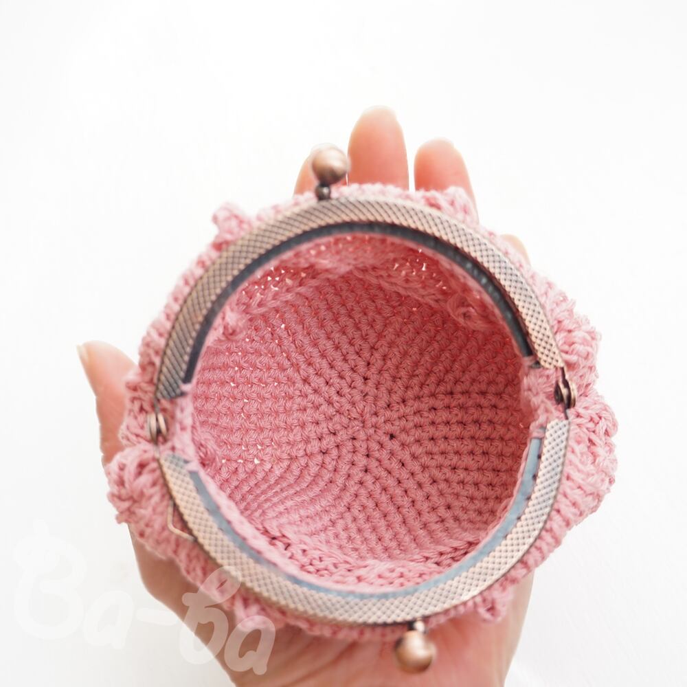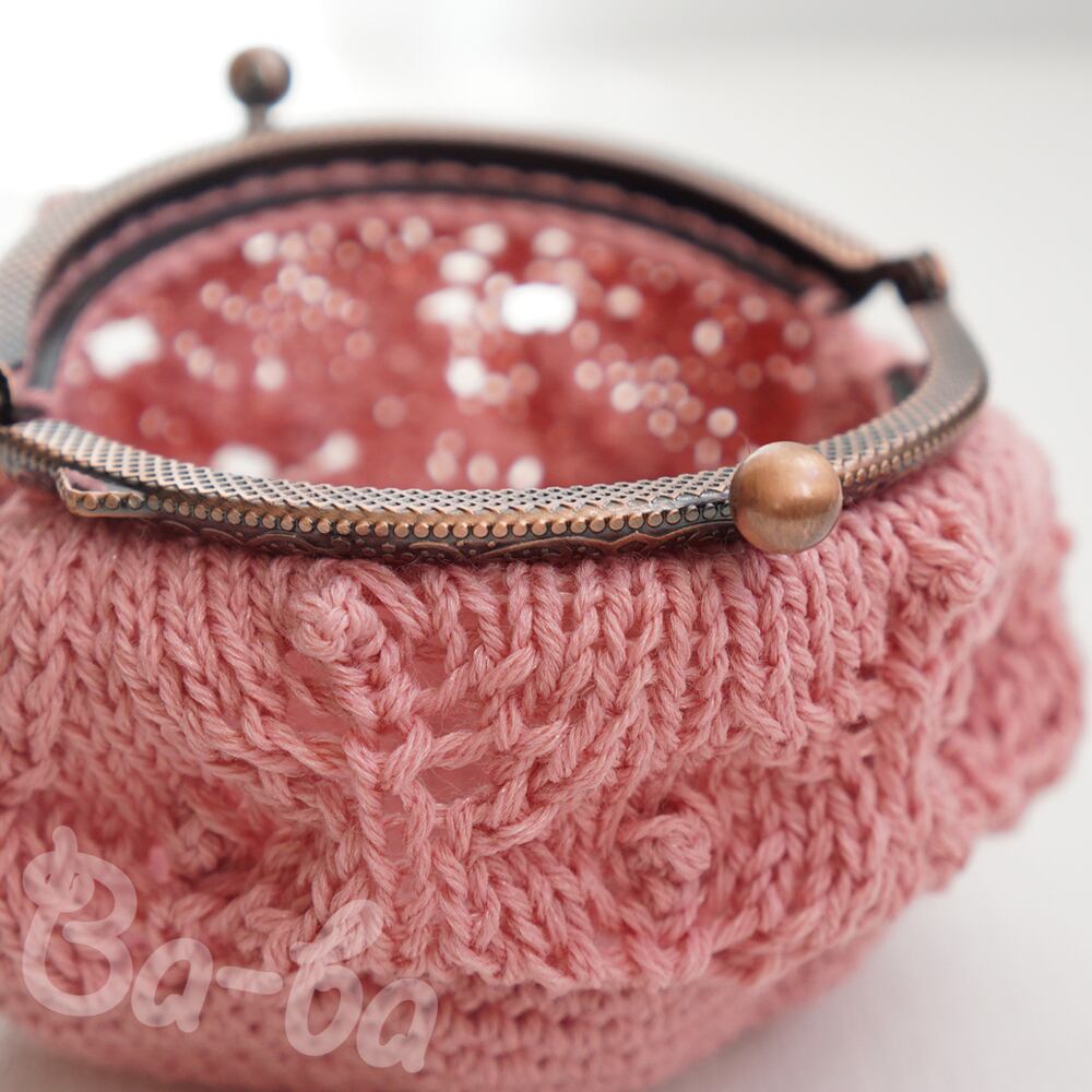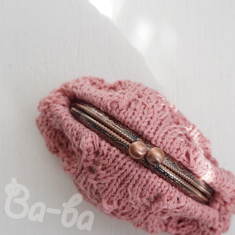 くすみピンク色サマーヤーンの編み地にブロンズ色の口金を合わせました。