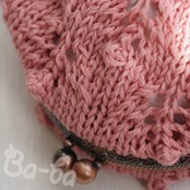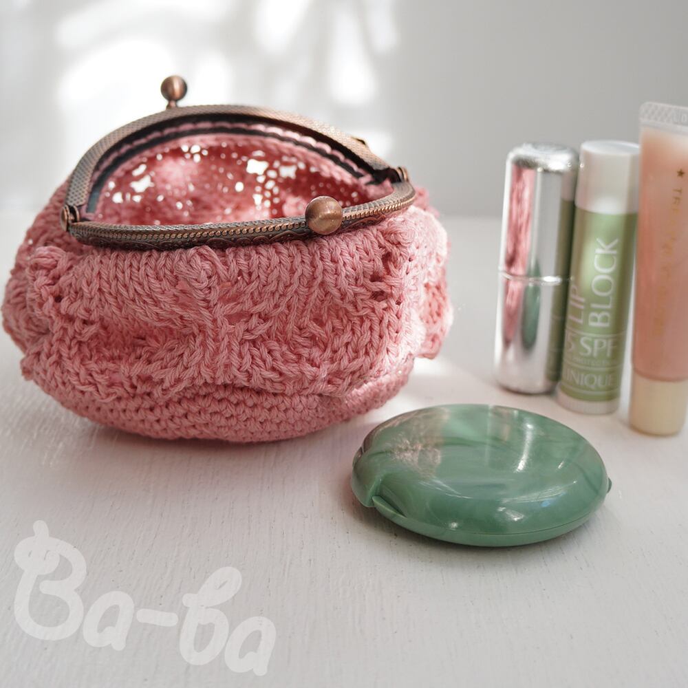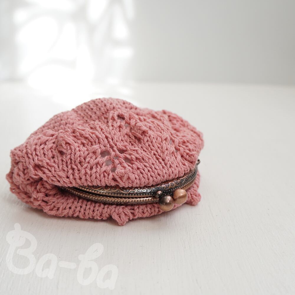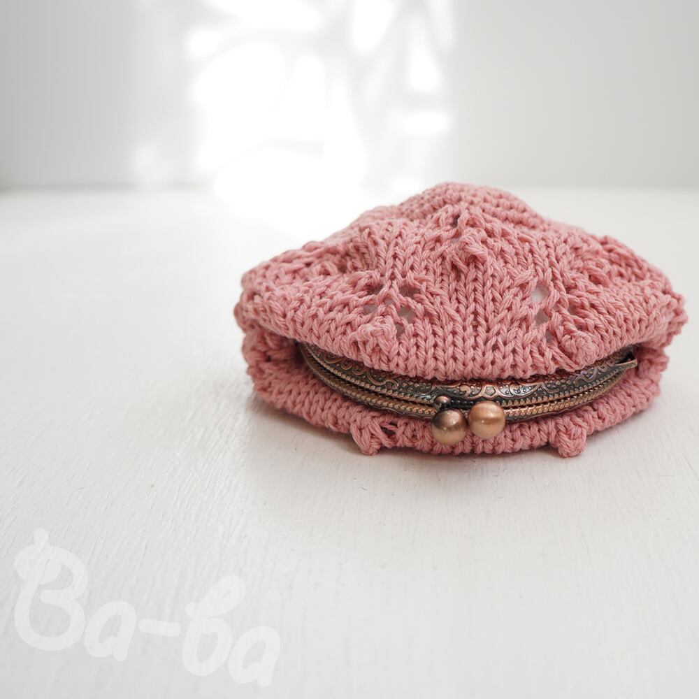 くすみピンク色サマーヤーンの編み地にブロンズ色の口金を合わせました。