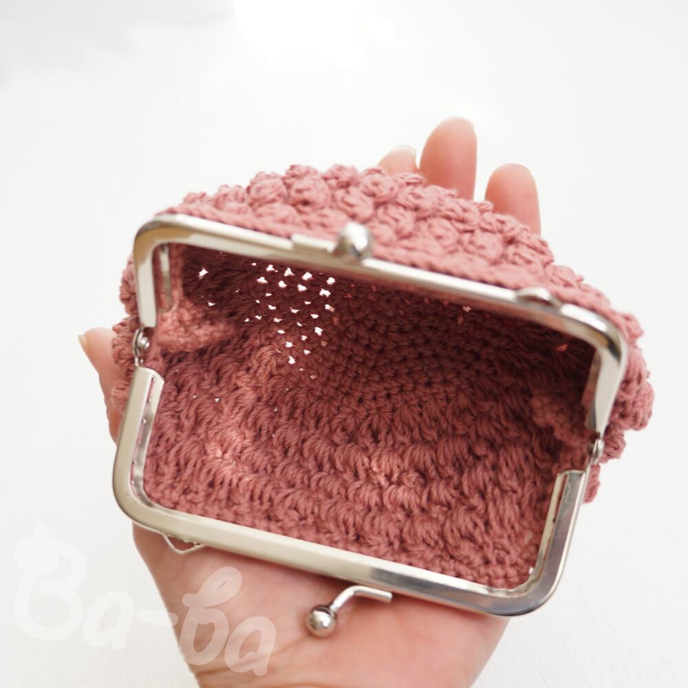 紅藤色の毛糸をふんわり軽~いがま口に仕上げました。