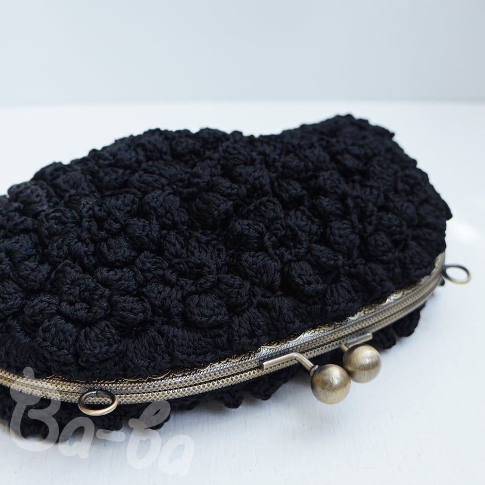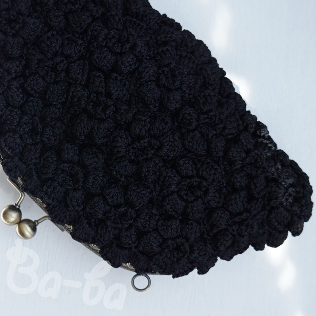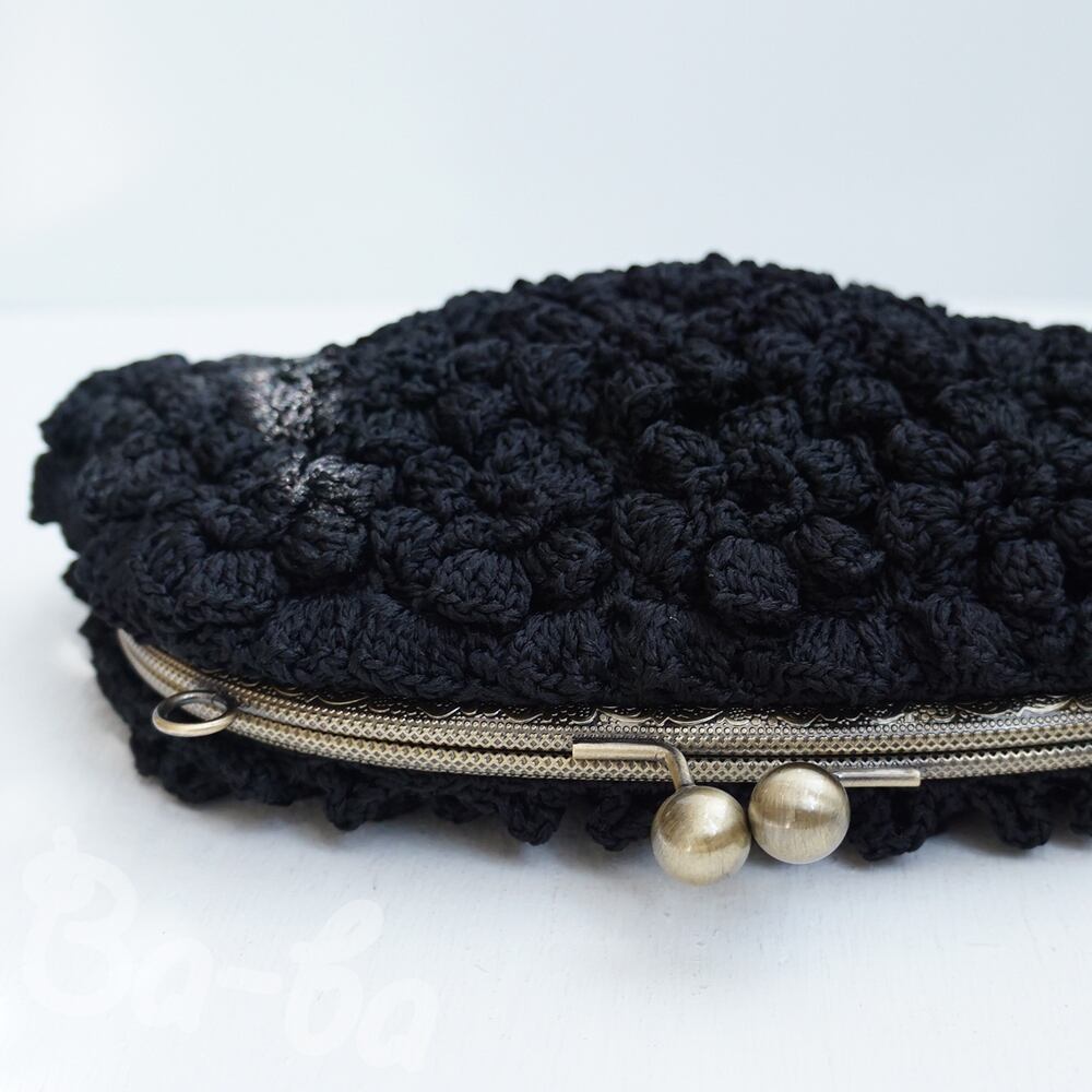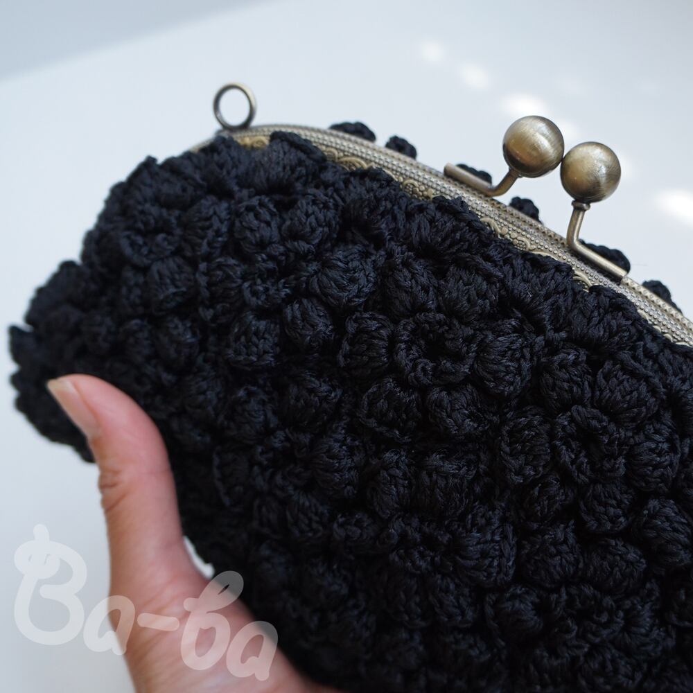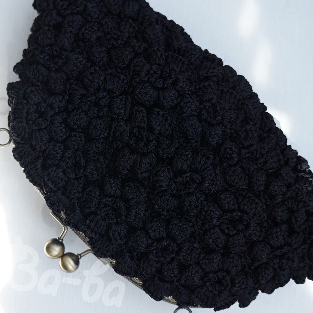 ばあば作、ポピーパフ編みのがま口バッグ(黒雛罌粟・C1616)