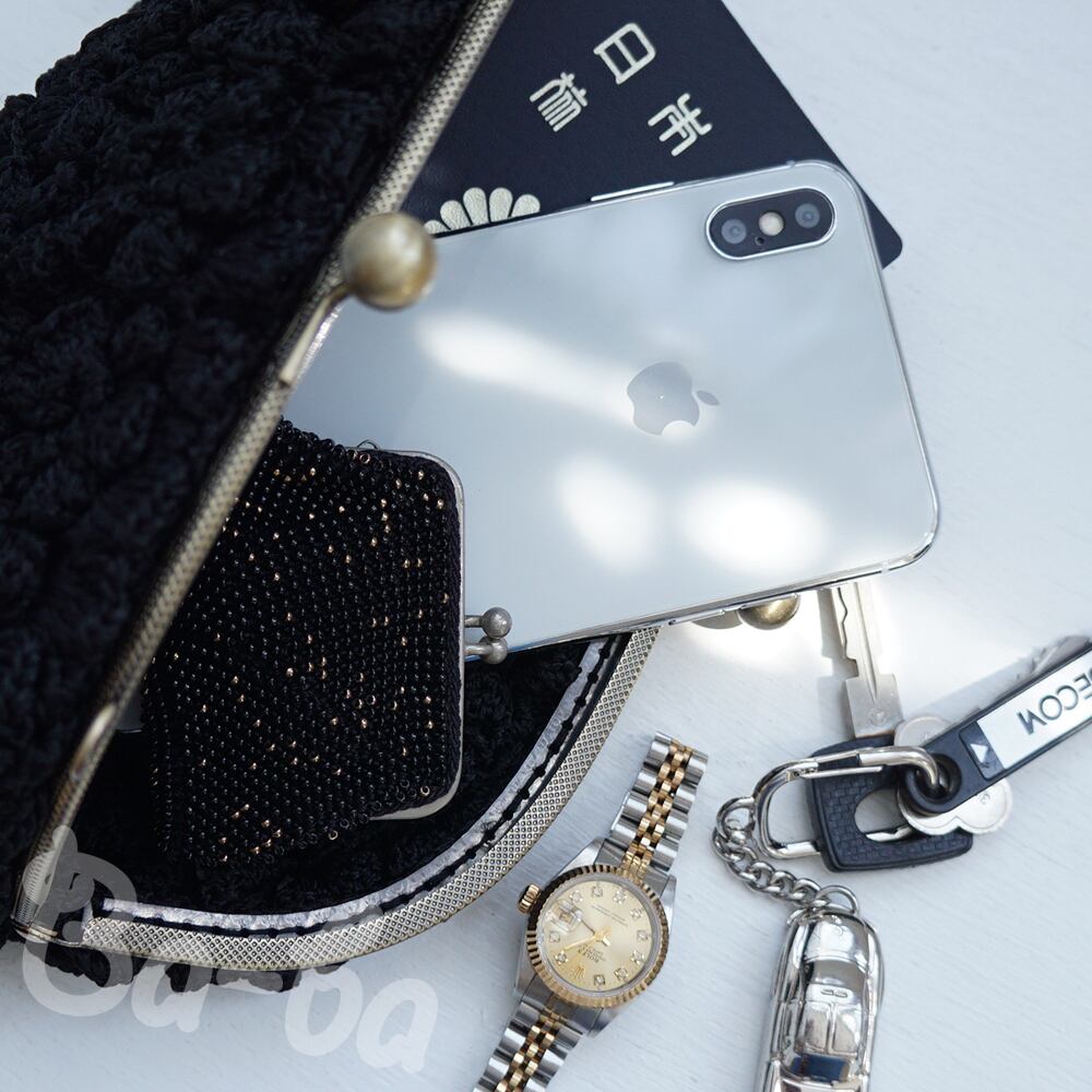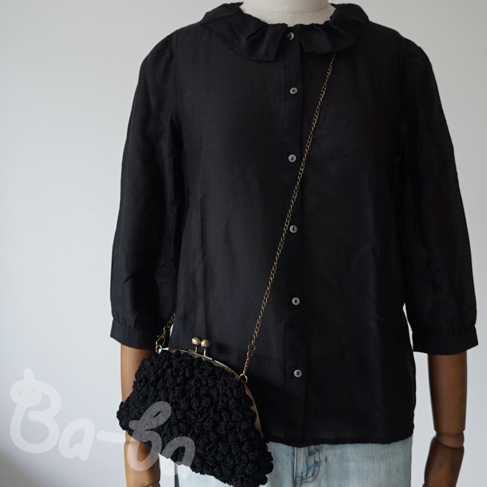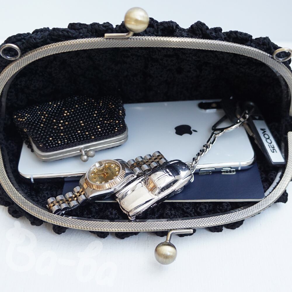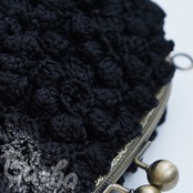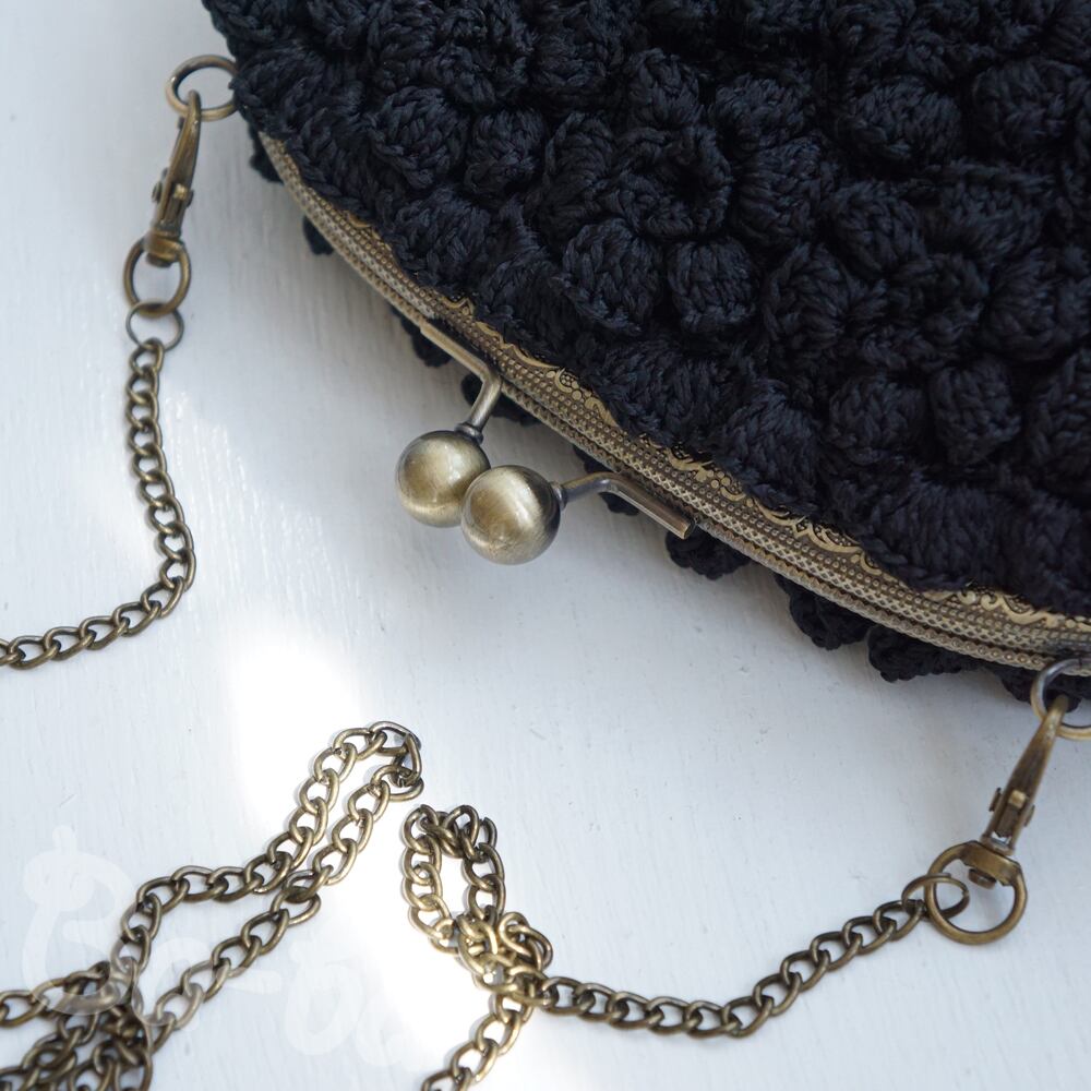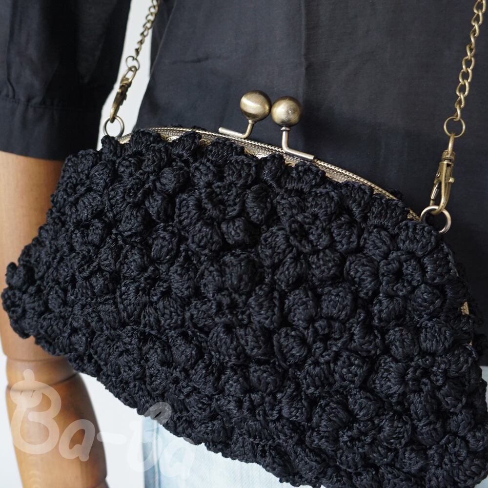 ばあば作、ポピーパフ編みのがま口バッグ(黒雛罌粟・C1616)