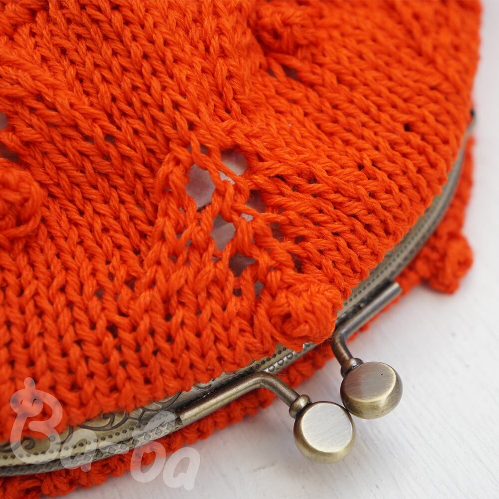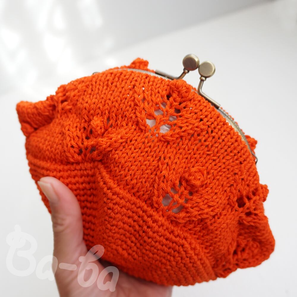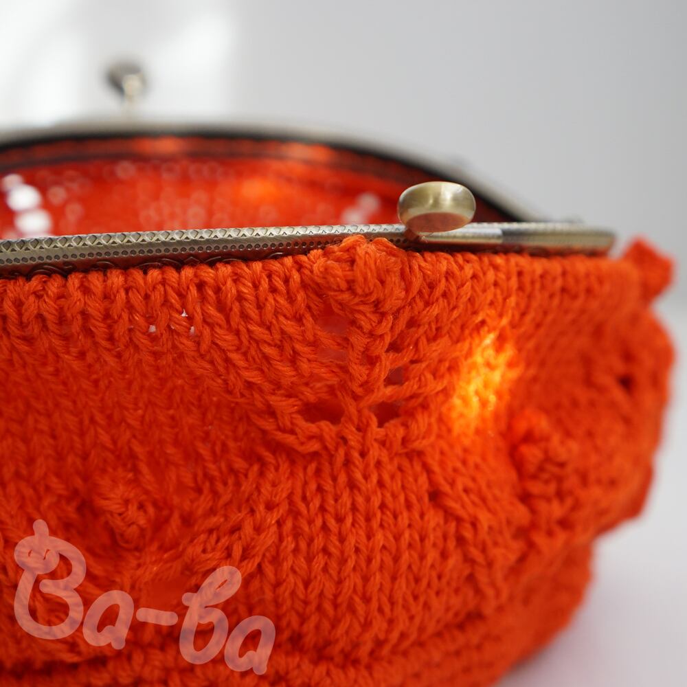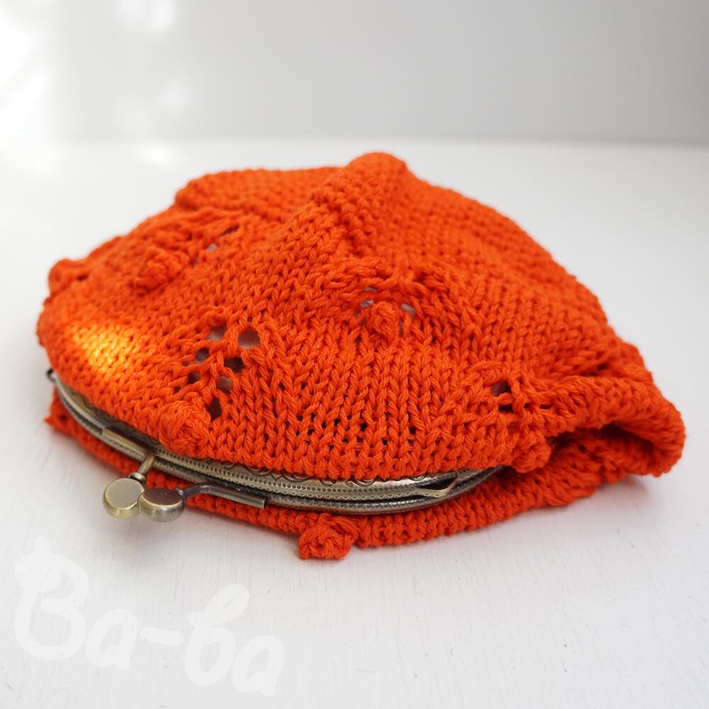 明るいオレンジ色のサマーヤーンを模様編みで編み上げ、がま口に仕上げました。