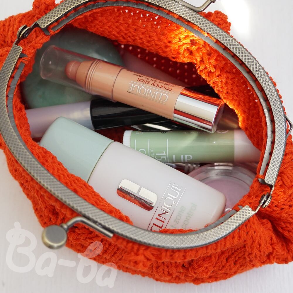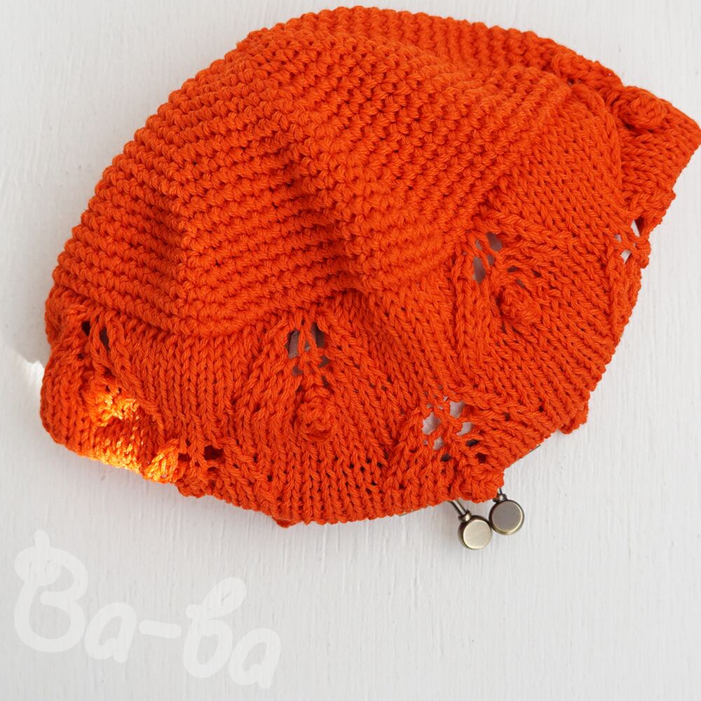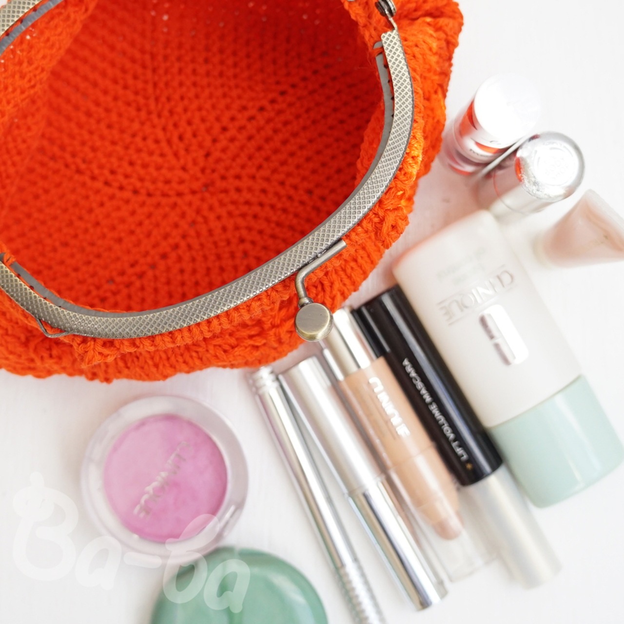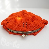 明るいオレンジ色のサマーヤーンを模様編みで編み上げ、がま口に仕上げました。