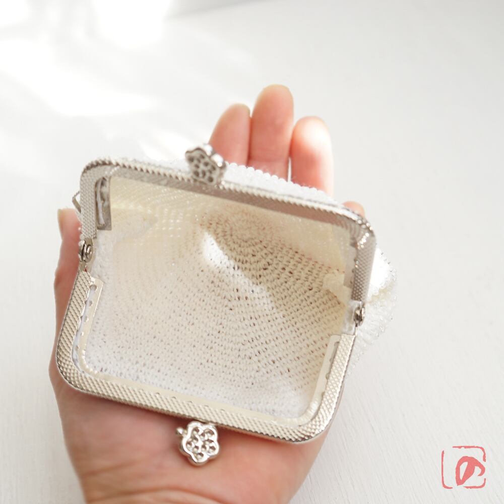 シルバーの口金に白い編地が爽やか、お花のつまみもカワイイです♡