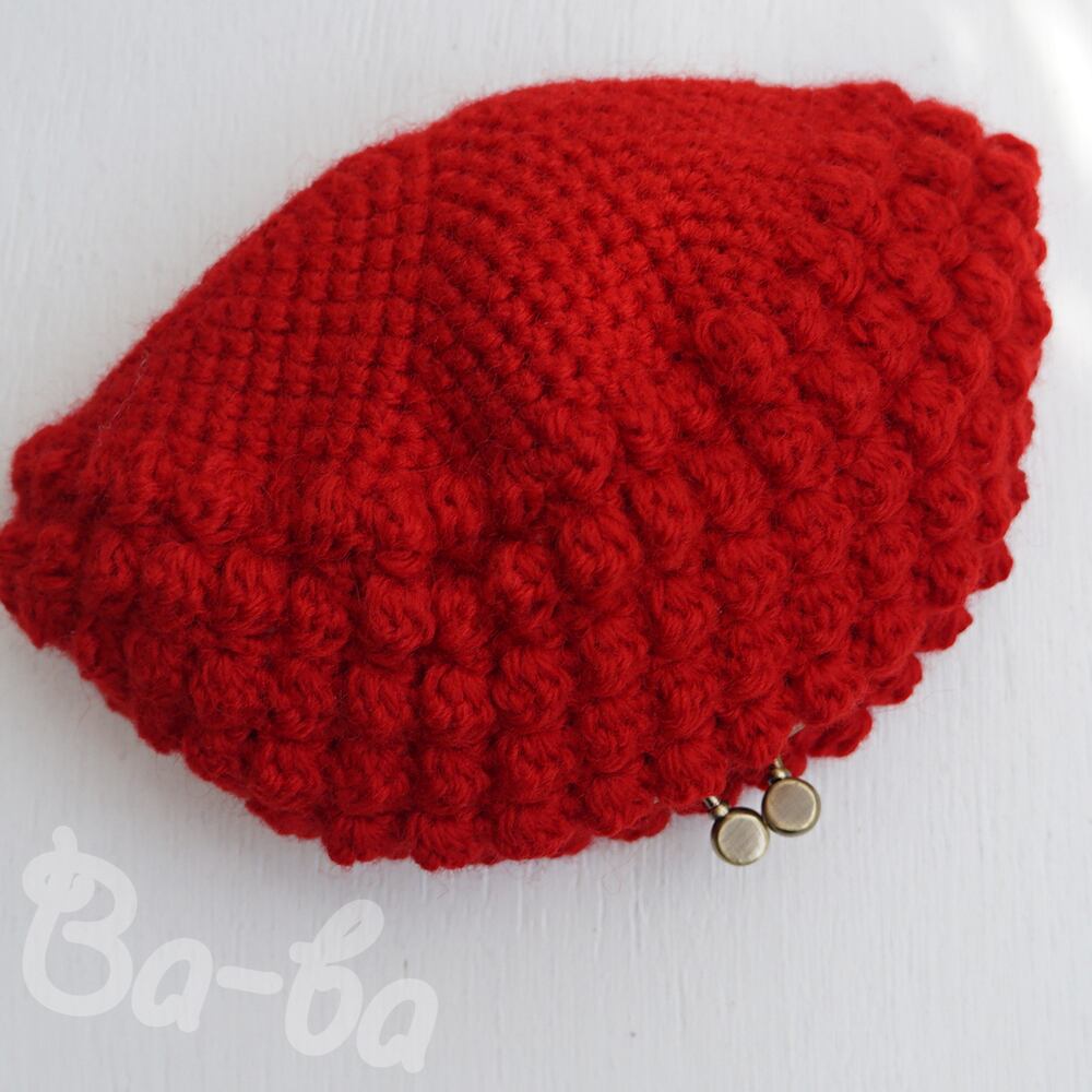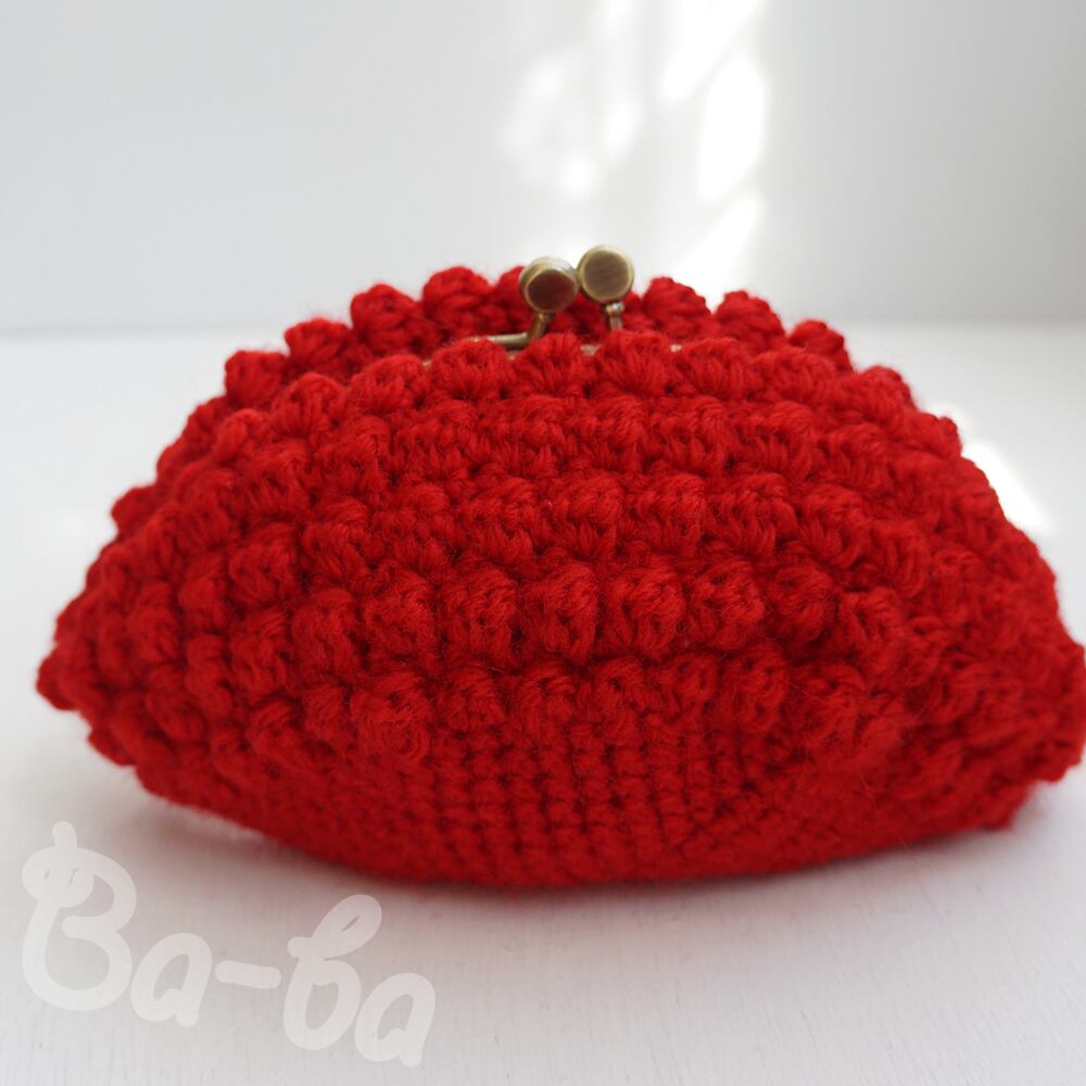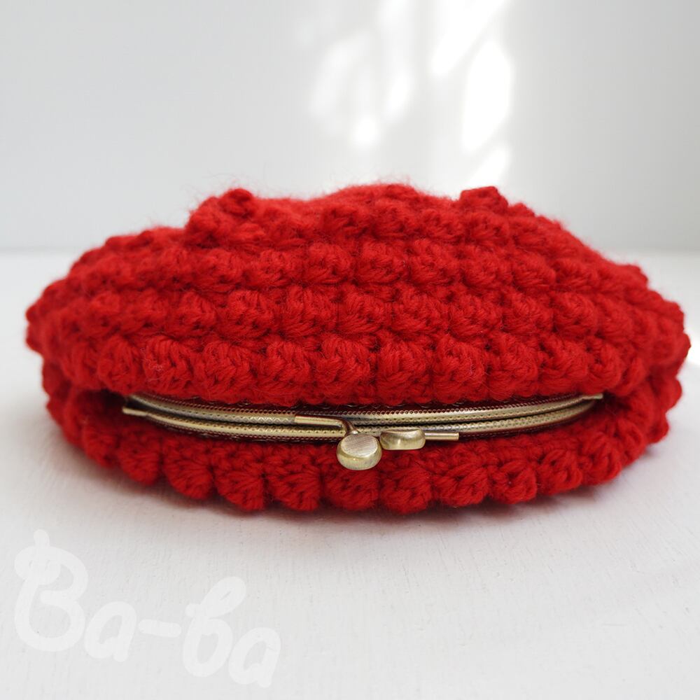 真っ赤な毛糸をバブルステッチで編み、がま口にしました。